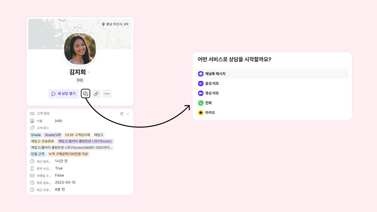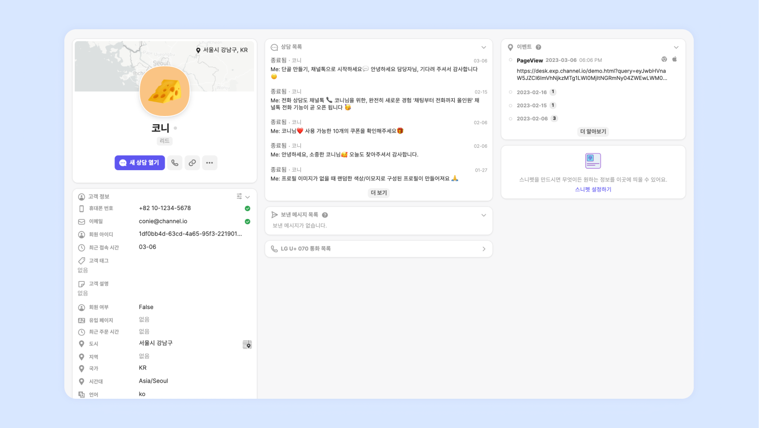 고객 프로필에 상세 화면에 들어가 고객 정보, 상담 목록, 이벤트 등의 고객의 상세 정보들을 한 눈에 확인할 수 있습니다.