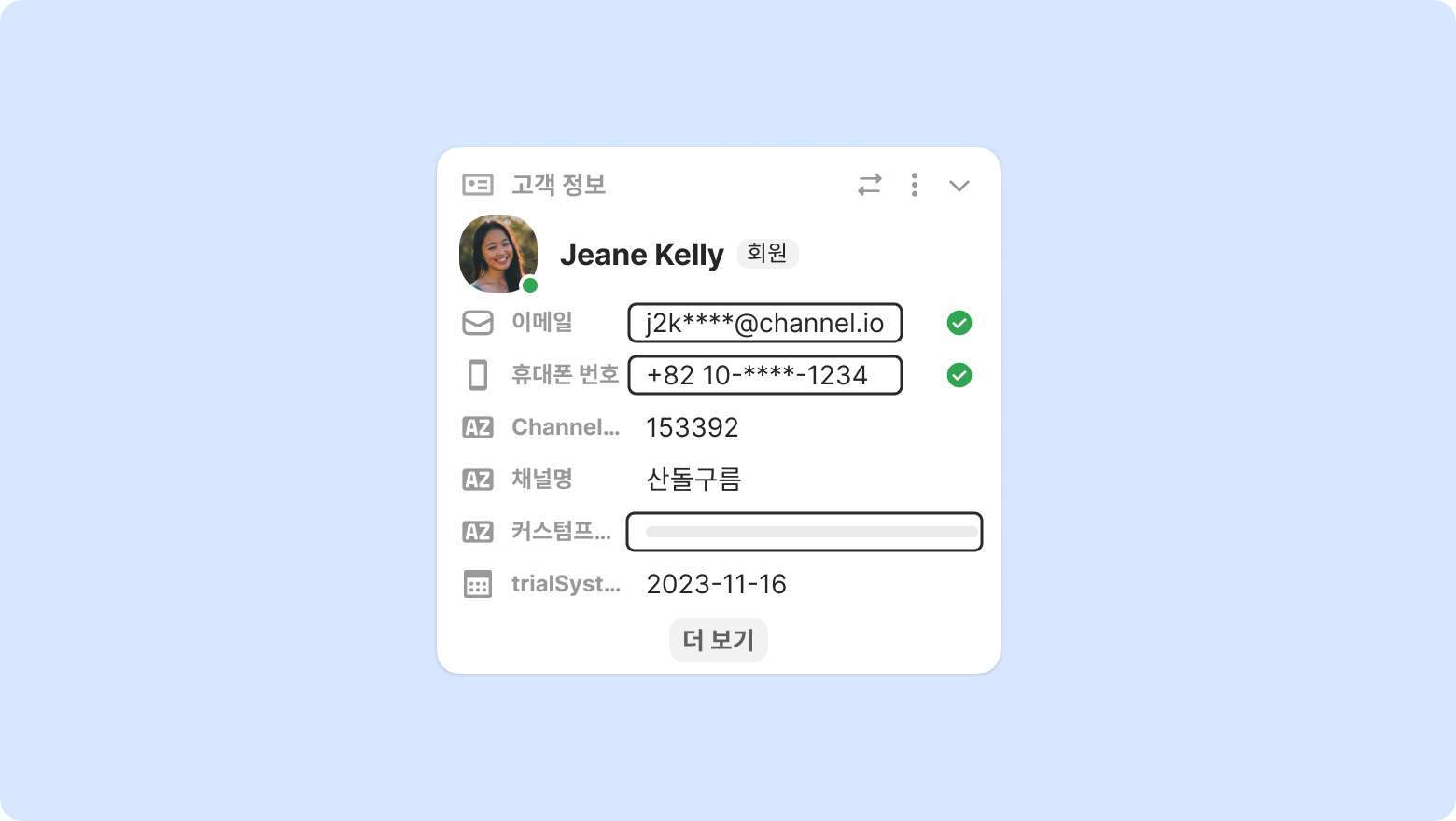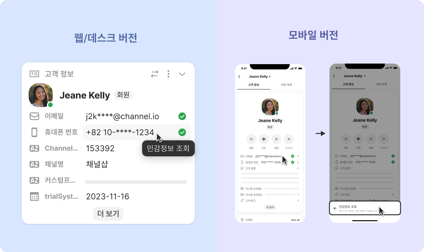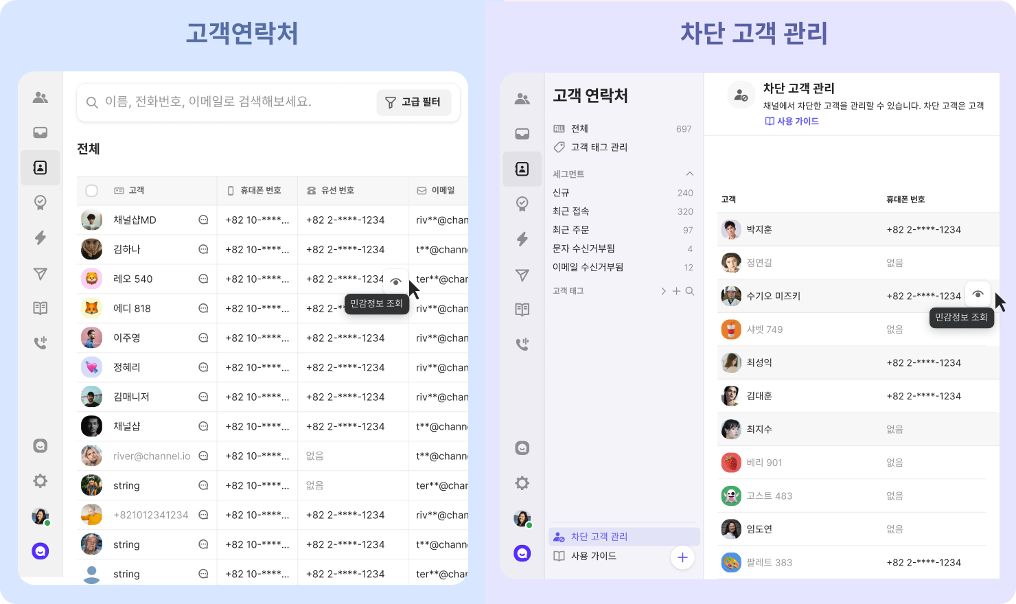 부분 가림 처리: 전화번호나 이메일 주소는 일부만 가려집니다. (예시 : 010-****-0000, aaa**@channel.io)