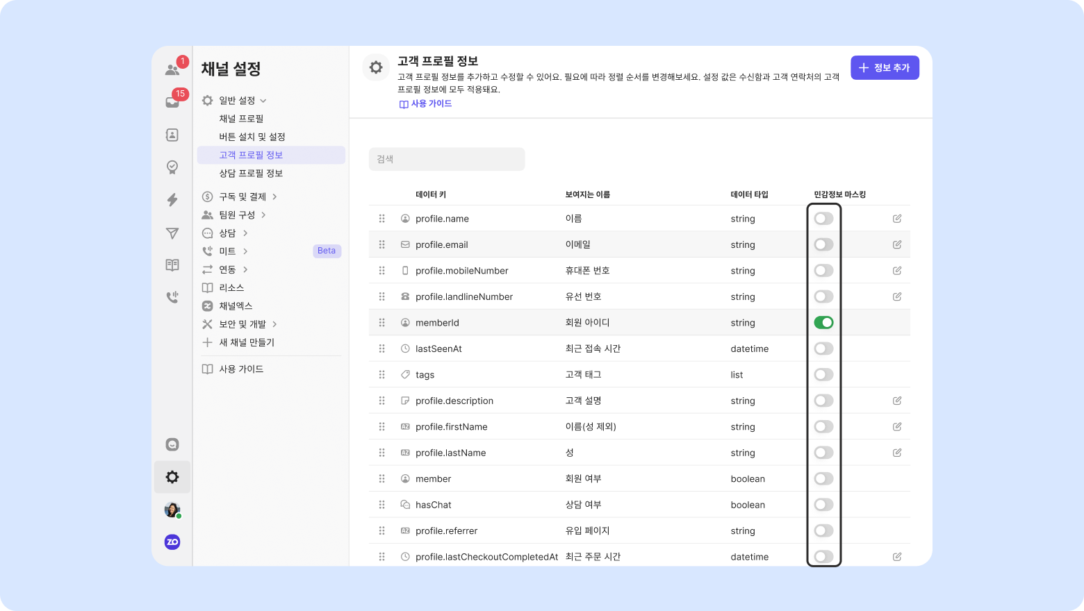 ‘민감정보 마스킹’ 기능을 사용하면 고객 프로필 내 일부 민감한 정보를 가림 처리 할 수 있습니다.