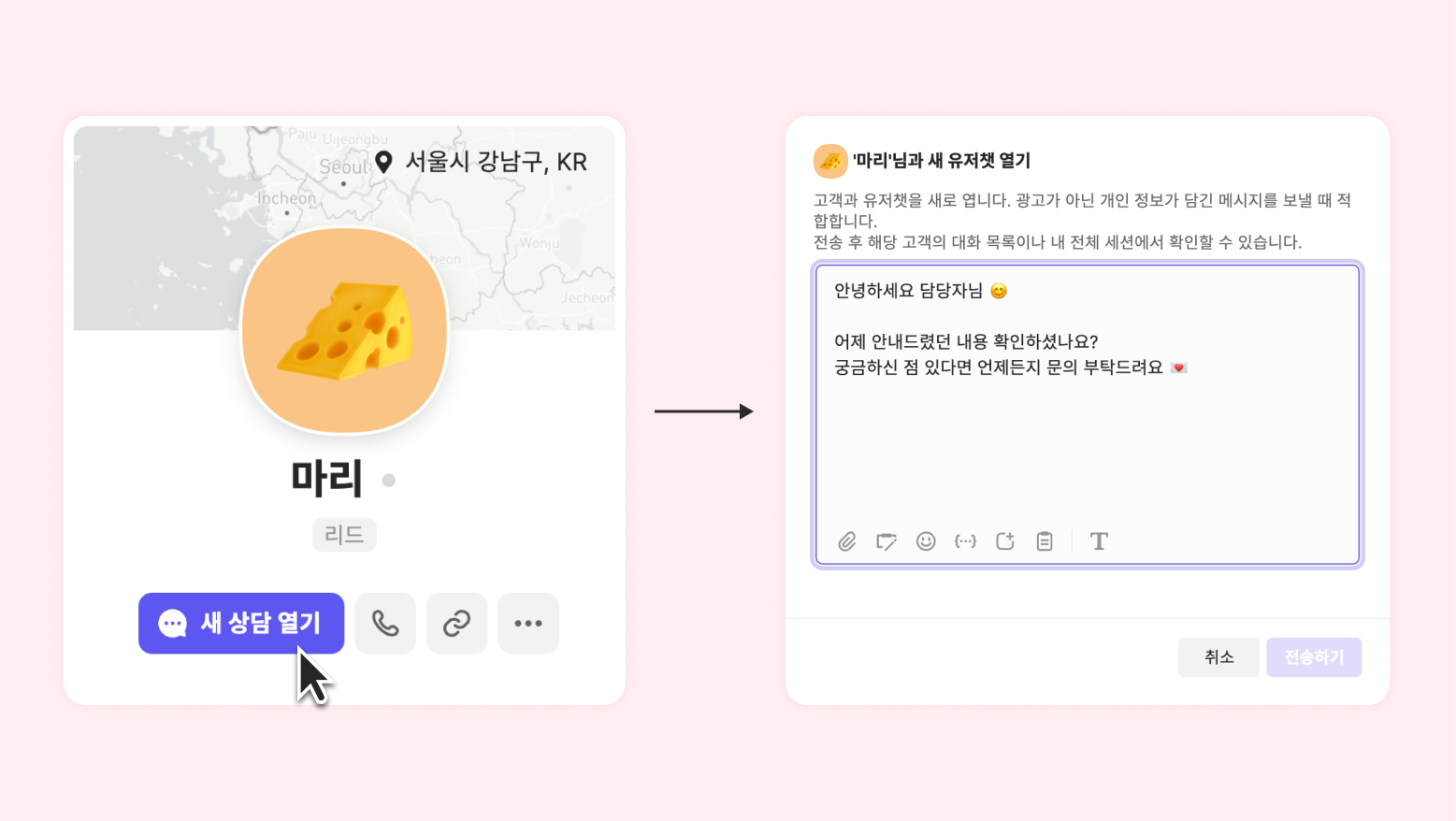 고객 프로필 상세 화면에서 [새 상담 열기]를 눌러 고객에게 먼저 메시지를 보낼 수 있습니다. 종료된 상담을 다시 열지 않고 새 문의로 고객과 채팅을 시작할 수 있어요.