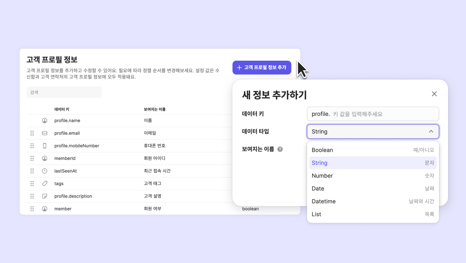 설정 경로: [채널 설정] - [일반 설정] - [고객 프로필 정보]에서 [+고객 프로필 정보 추가] 클릭