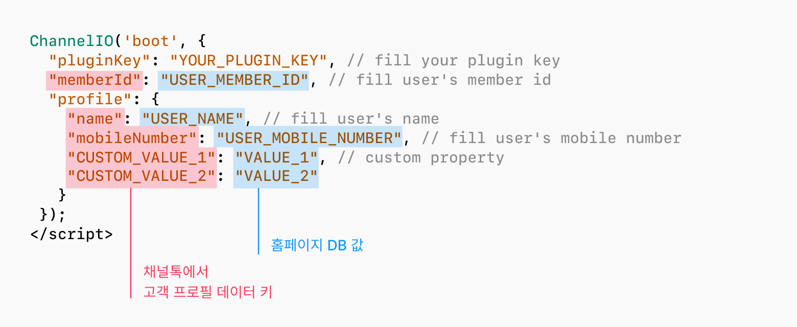 채널톡 설치 스크립트의 profile 부분에 연동을 원하는 데이터 키 값을 입력해주세요.