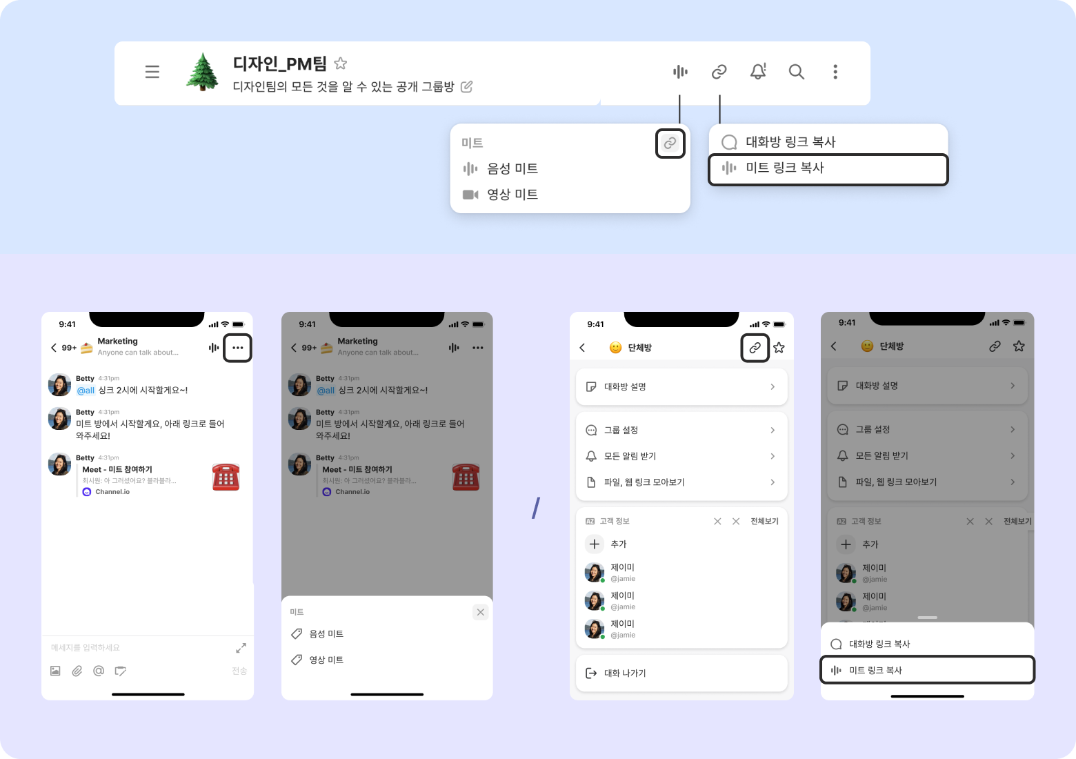 미트 링크는 팀챗에서만 지원됩니다. 추후 유저챗 미트 링크도 지원 예정입니다.