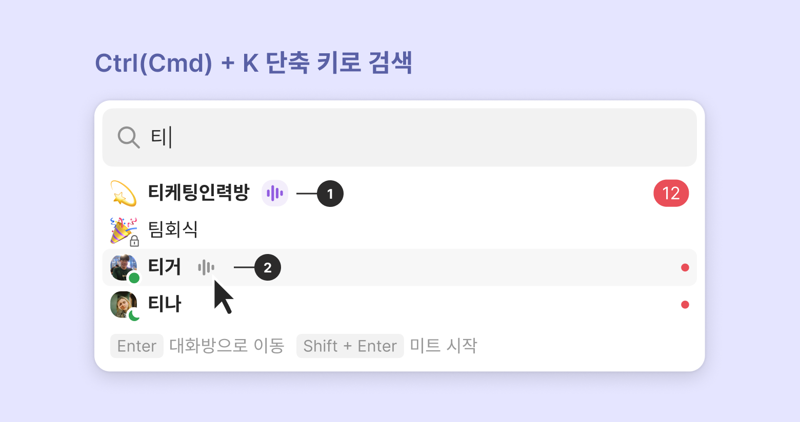 Ctrl(Cmd)+K 단축키를 누르면 검색을 통해 팀 미트를 빠르게 실행할 수 있습니다. 검색 시 공개 그룹, 참여 중인 비공개 그룹, 팀 멤버가 검색 결과 목록에 표시됩니다.