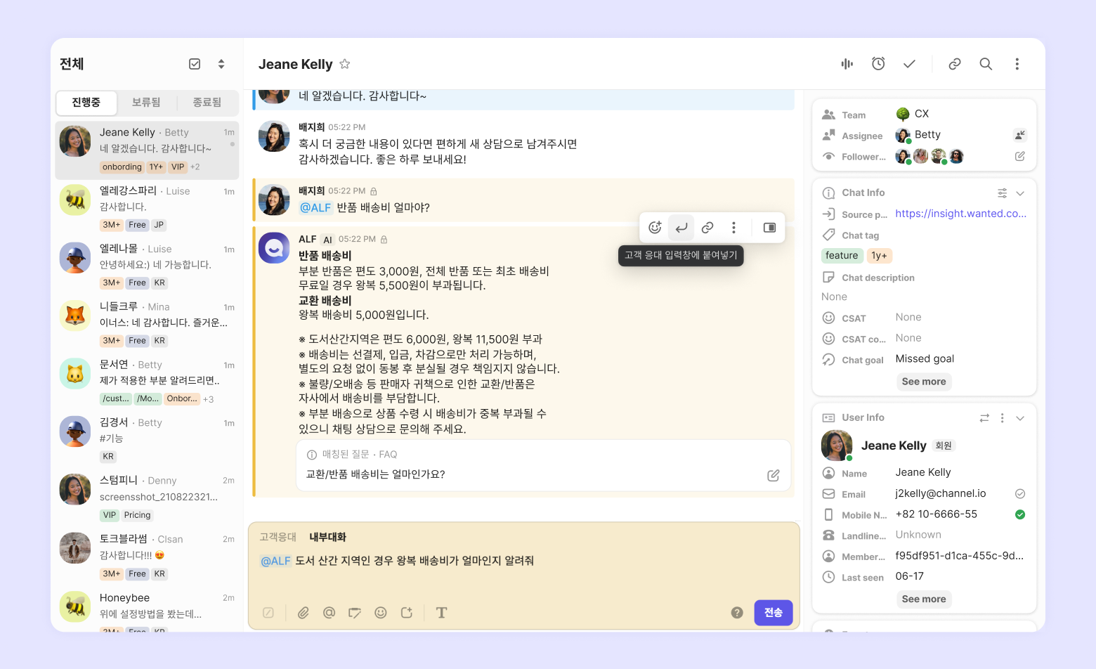 @ALF를 호출하면 내부대화로 답변이 남겨져요.(고객에게는 보이지 않아요.)메시지에 마우스를 올리면 보이는 '고객 응대 입력창에 붙여 넣기'를 클릭하면 팀 ALF의 답변을 고객 응대 창으로 가져와 활용할 수 있어요.