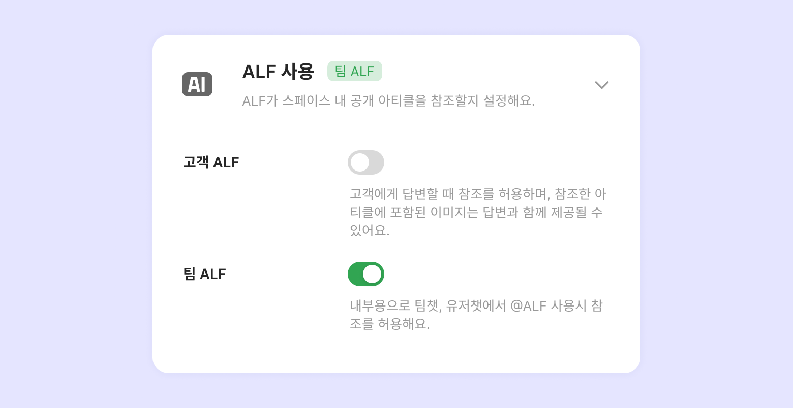 고객 ALF: ALF가 고객을 응대할 때 공개된 FAQ, 아티클을 참조할지 여부를 선택해요. 고객 응대 시 참조할 수 없는 내부용 정보가 포함되어 있다면 고객 ALF는 꺼주세요.