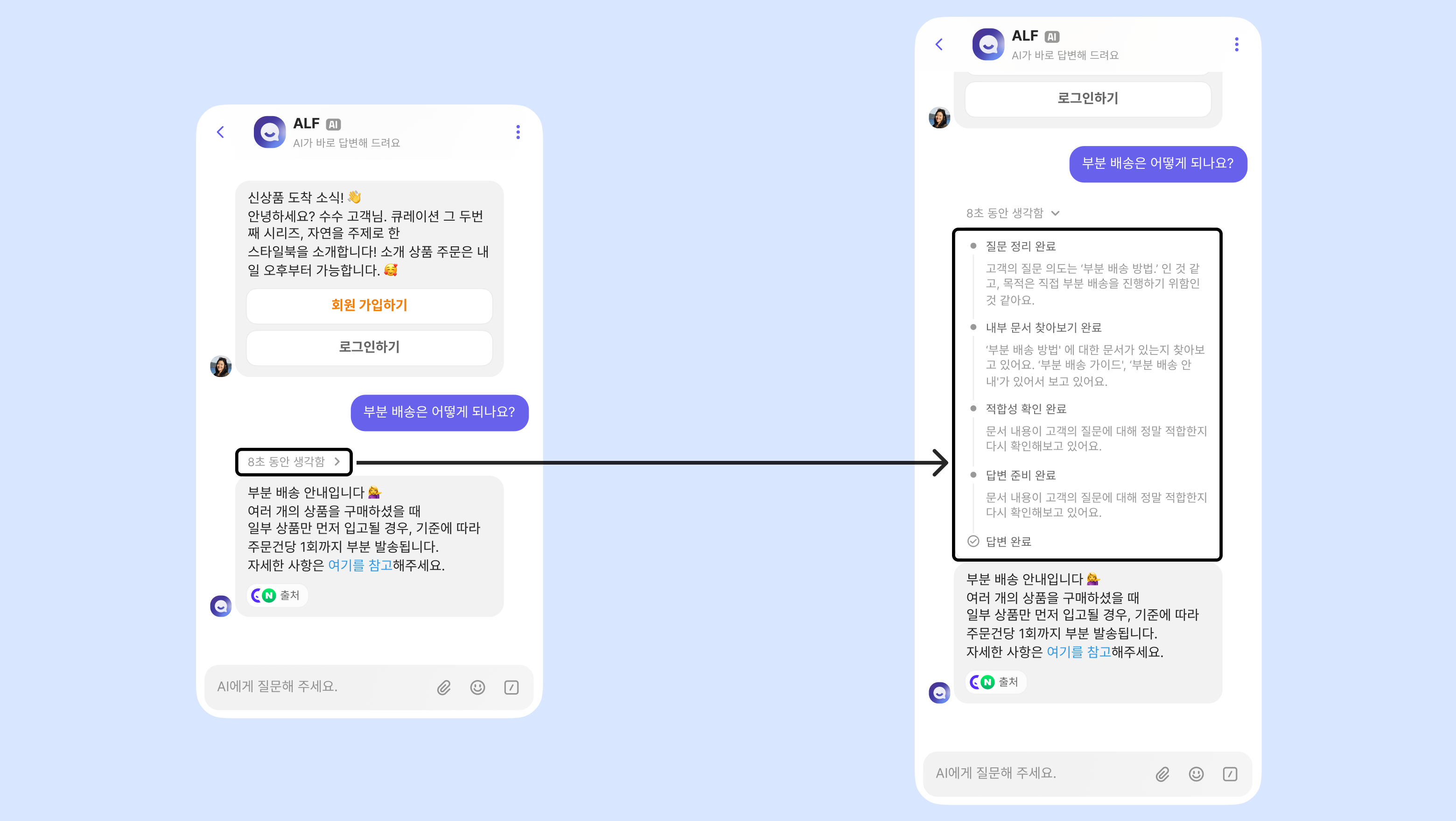 또한 ALF에는 에이전틱 서치 기술이 적용되어, 고객 문의의 의도를 파악하고 필요한 정보를 능동적으로 수집하며, 최종적으로 실행까지 이어지는 완전한 상담 자동화가 가능합니다.