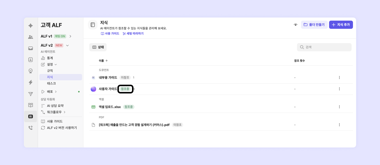 등록한 지식이 있는데도 ALF가 해당 지식을 참조하여 답변하지 못하는 경우 아래 ①~③ 항목을 점검해 주세요.