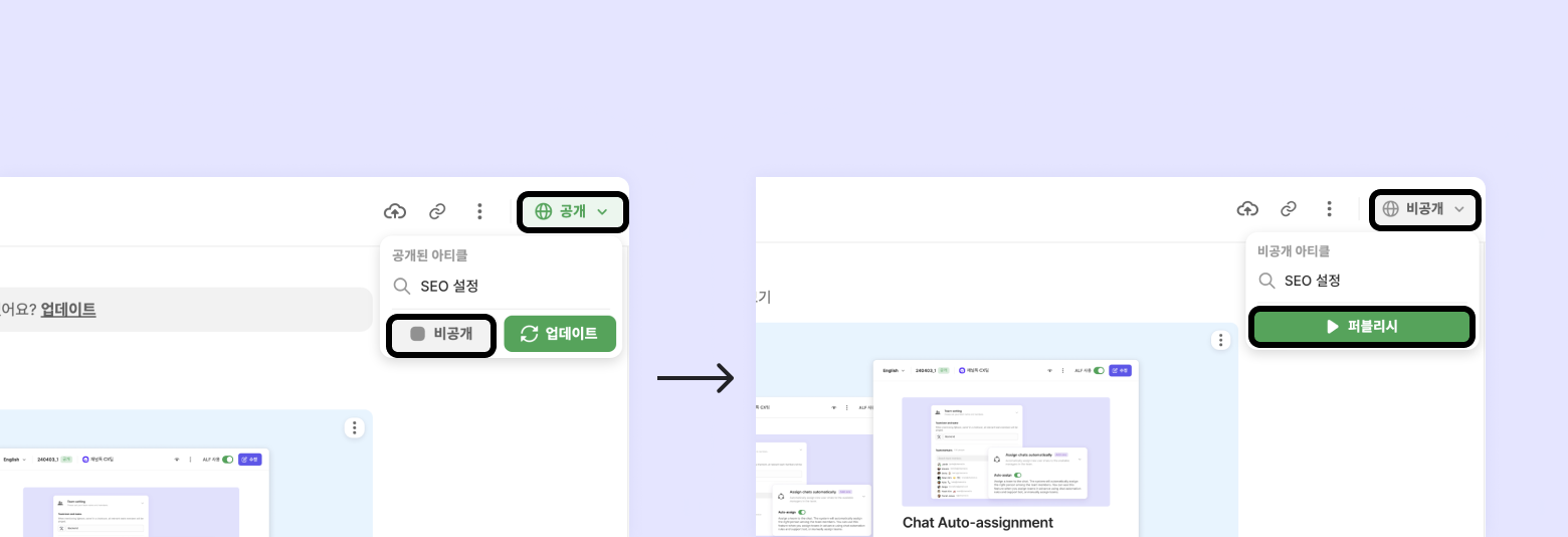 이미 공개 상태라면 데이터 갱신이 되지 않은 문제일 수 있으므로 해당 아티클(또는 FAQ)를 비공개로 잠시 전환 후 다시 퍼블리시(공개) 해주세요.