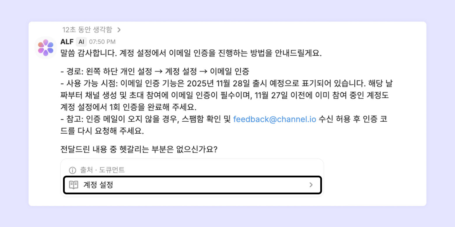 ALF가 아티클을 참조해 답변을 구성하는 과정에서, 문서 내 여러 문장이 비슷하거나 표현이 모호한 경우 AI가 그중 하나를 가장 관련성이 높다고 판단해 선택하는 특성이 있습니다. 이 때문에 실제로는 문서에 없는 내용임에도, 문서 내 유사한 문장을 잘못 근거로 삼아 오답변이 발생할 수 있습니다.