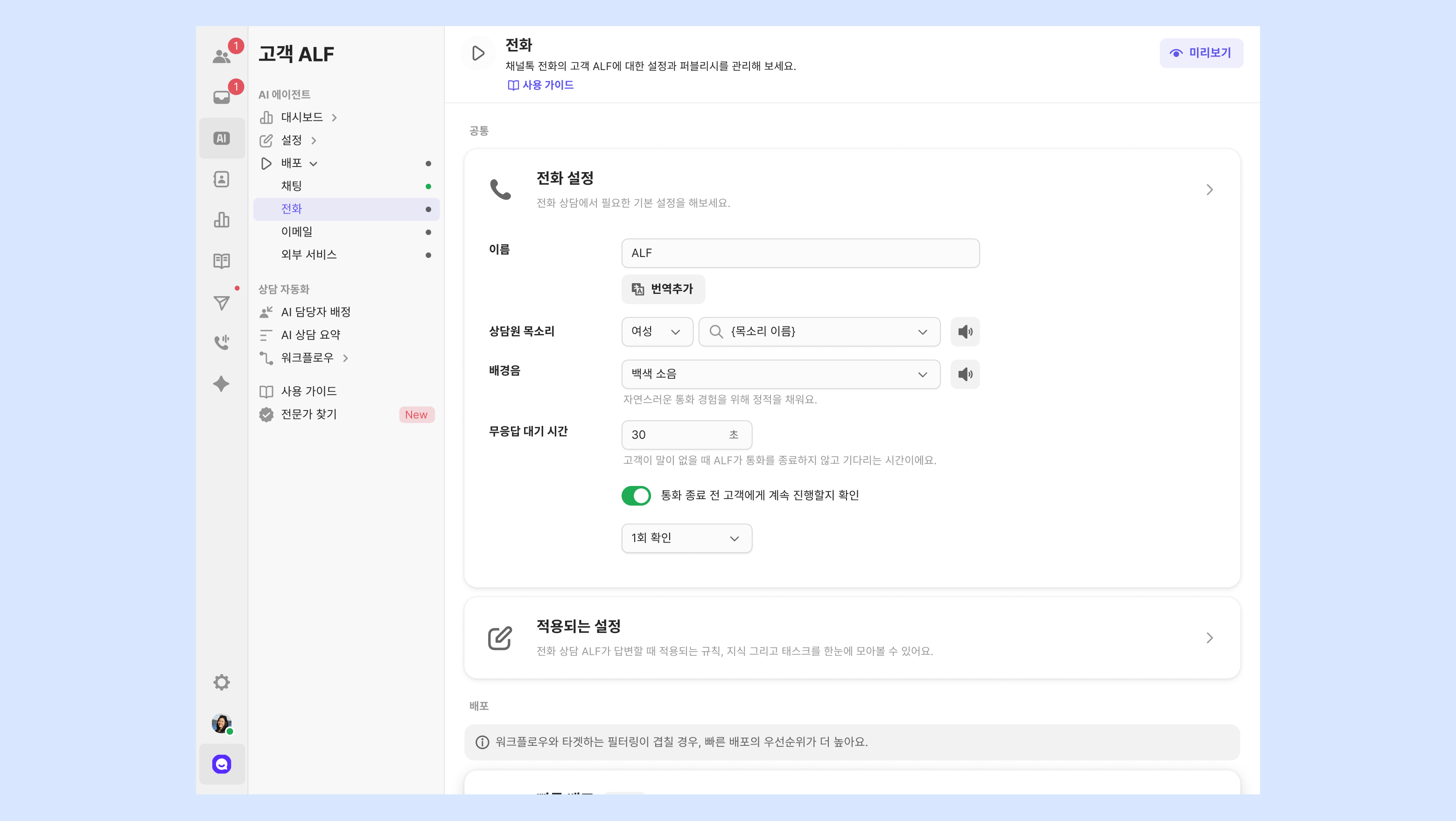 경로 : [AI 메뉴] - [고객 ALF] - [설정] - [배포] - [전화] - [빠른 배포] 배포를 눌러 주세요.
