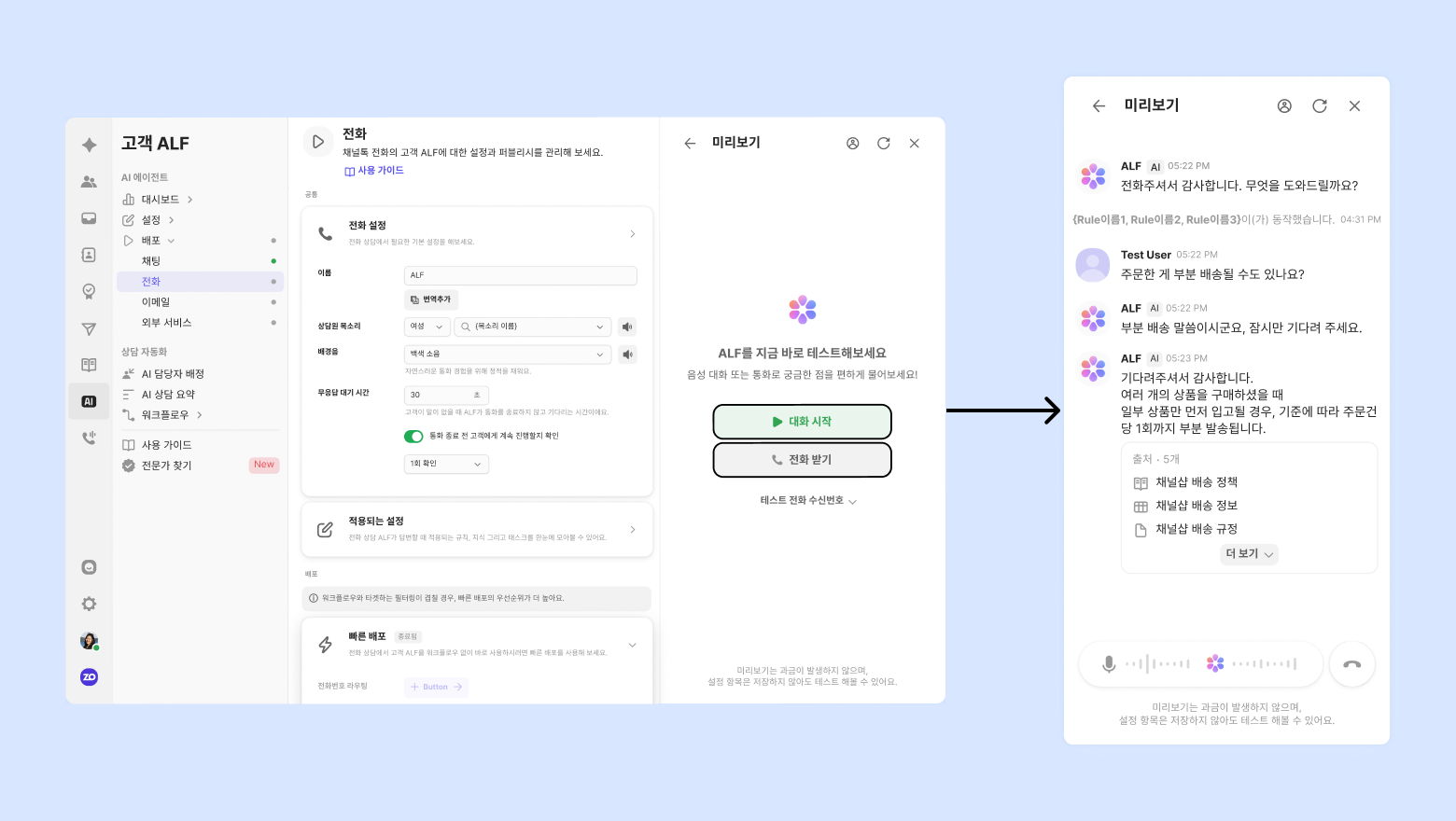 고객이 전화를 걸면 ALF가 먼저 응대하여 문의 내용을 안내하고, 필요한 경우 담당자에게 연결해 주는 베타 기능입니다.