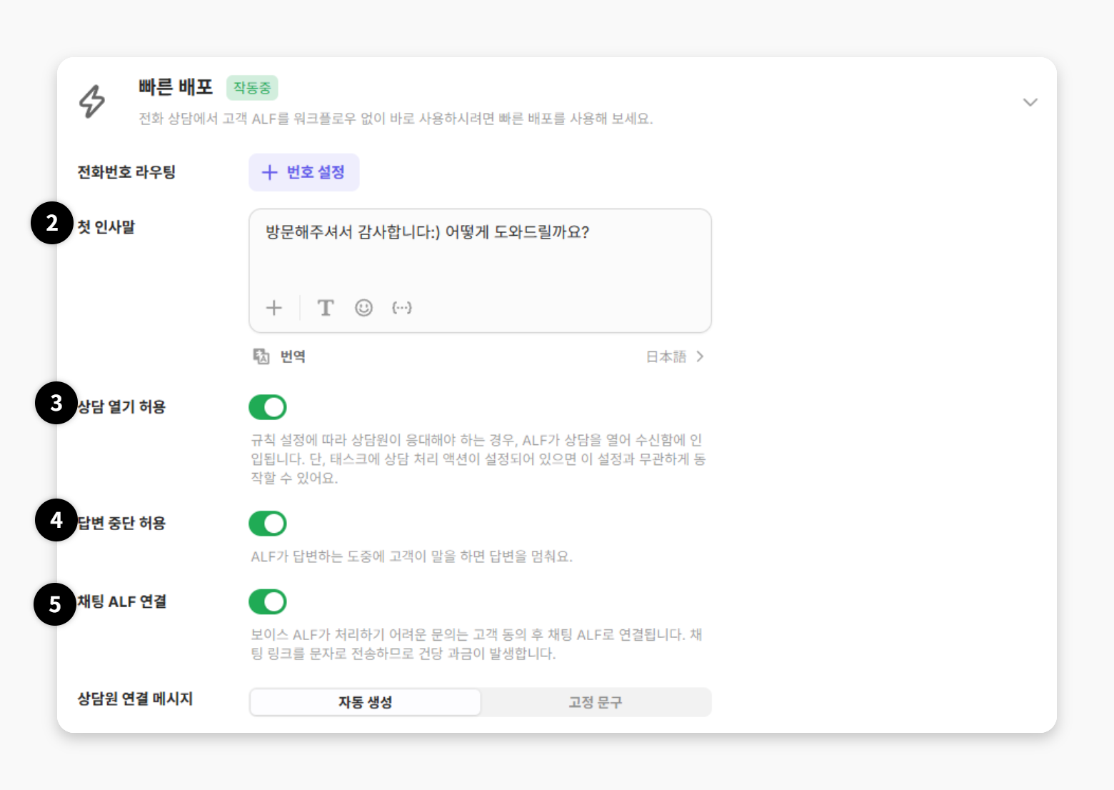 경로 : [AI 메뉴] - [고객 ALF] - [설정] - [배포] - [전화] - [빠른 배포] - ALF의 첫 인사말을 설정해주세요.