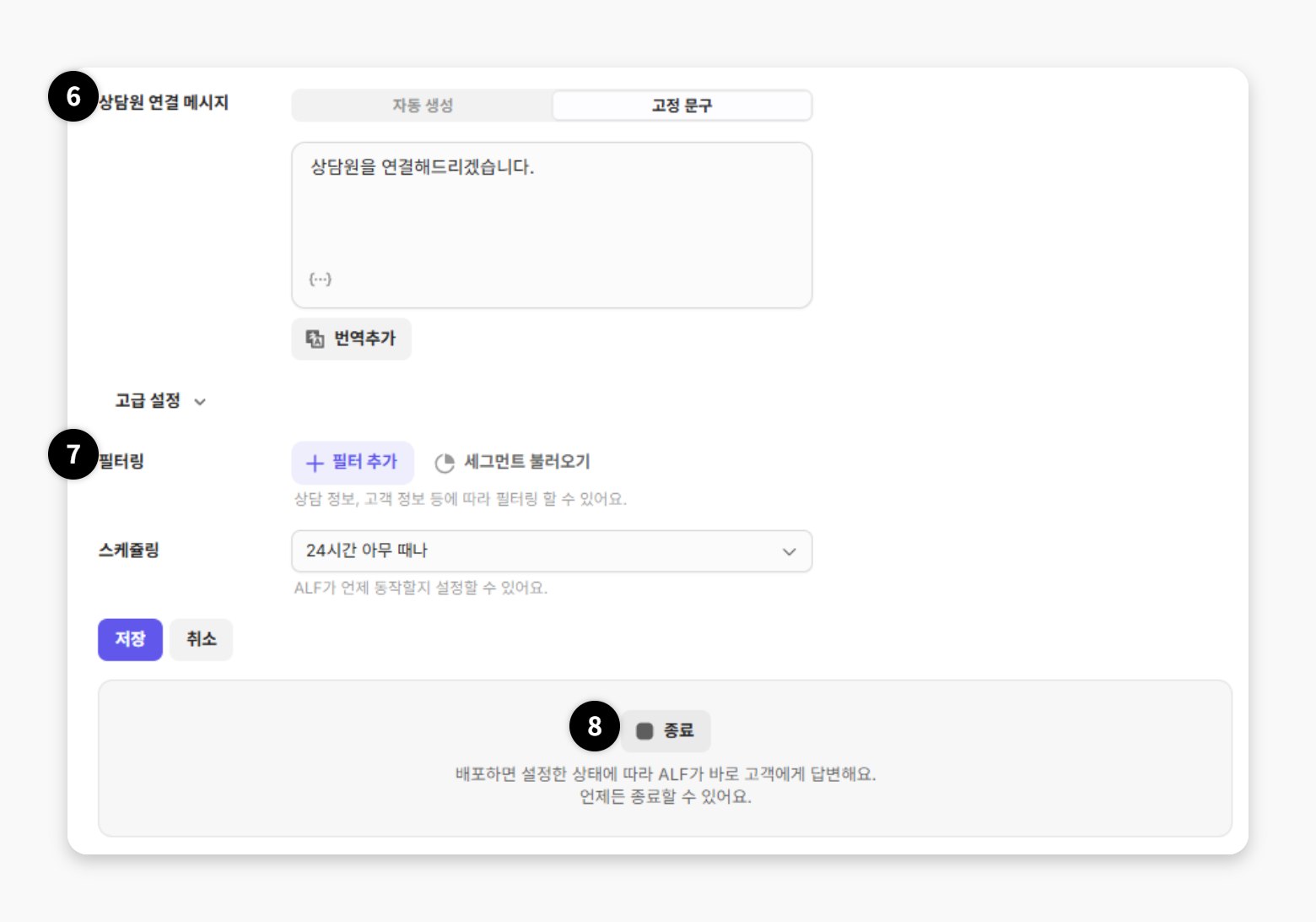 ALF 응대 후 상담원 연결이 필요할 때 고객에게 안내되는 메시지를 설정할 수 있습니다.