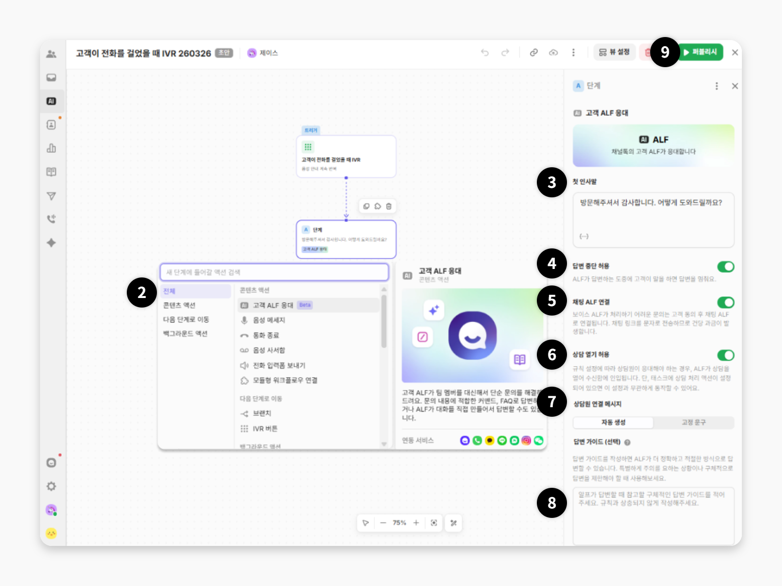 IVR 워크플로우를 설정하여 음성 버튼 및 음성 메시지 등의 액션을 구성하고, 원하는 단계에 ALF 액션을 추가하는 방식입니다. [AI 메뉴] - [고객 ALF] - [설정] - [배포] - [전화] - [워크플로우]에서 전화 ALF 액션이 설정이 되어 있는 작동중 상태의 워크플로우를 확인할 수 있습니다.