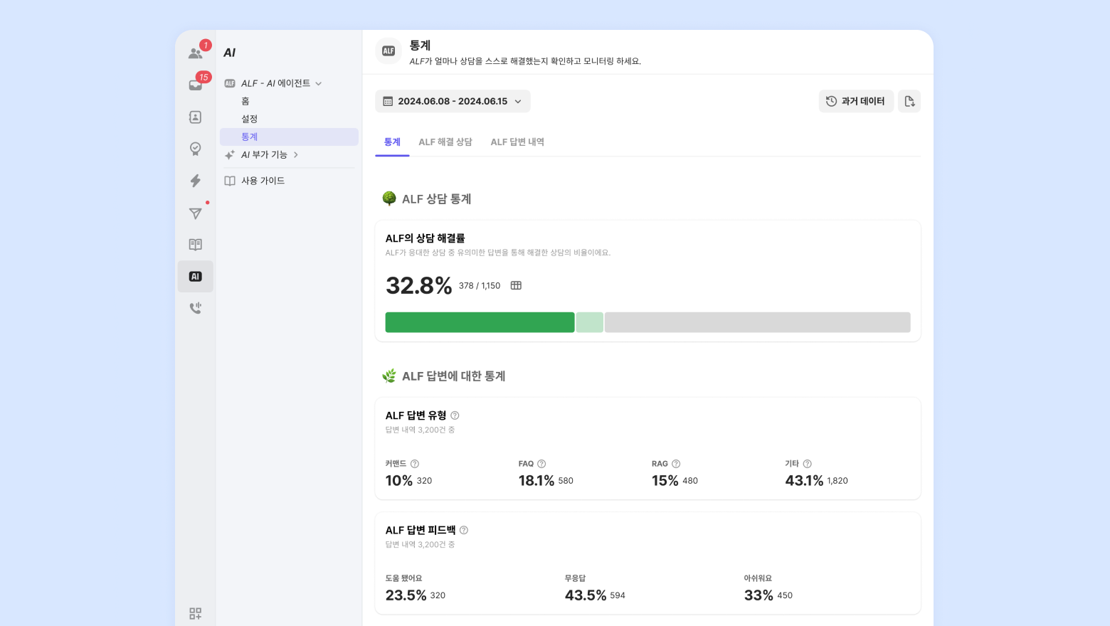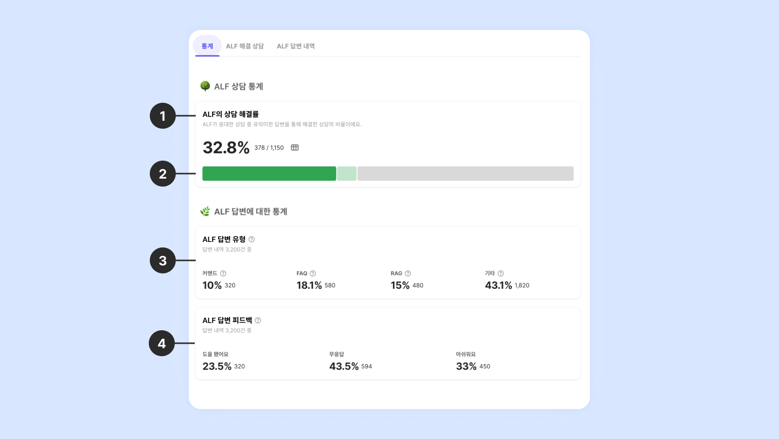 ALF가 답변한 모든 횟수와 유형별 횟수에 대해 확인할 수 있습니다.