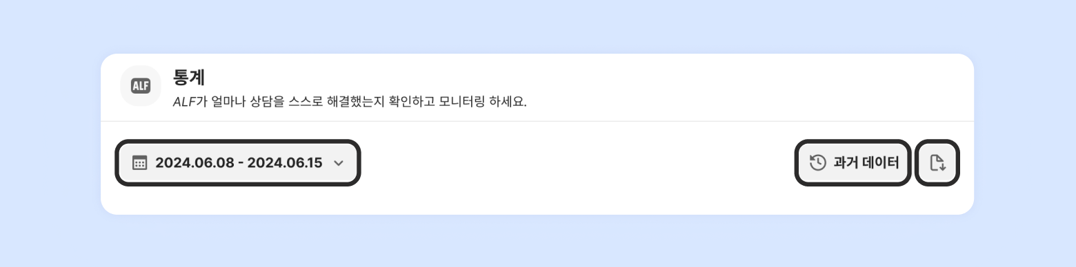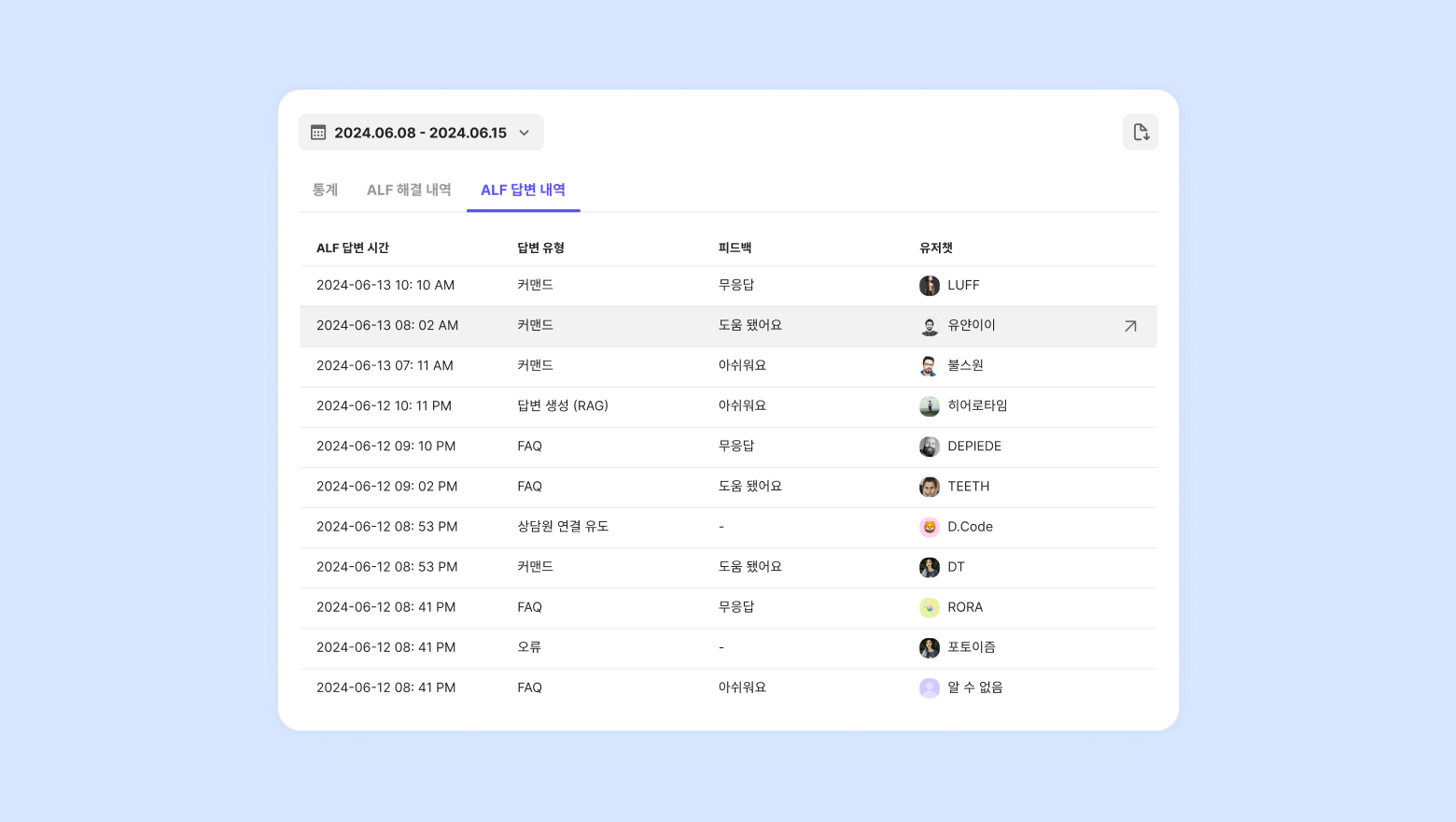 ALF 통계 내 우측 상단 다운로드 버튼을 통해 ALF가 응대한 상담만 모아서 다운로드가 가능합니다. 어떤 내용을 참고했는지, 피드백을 기반으로 필터링해서 확인해 볼 수 있습니다.