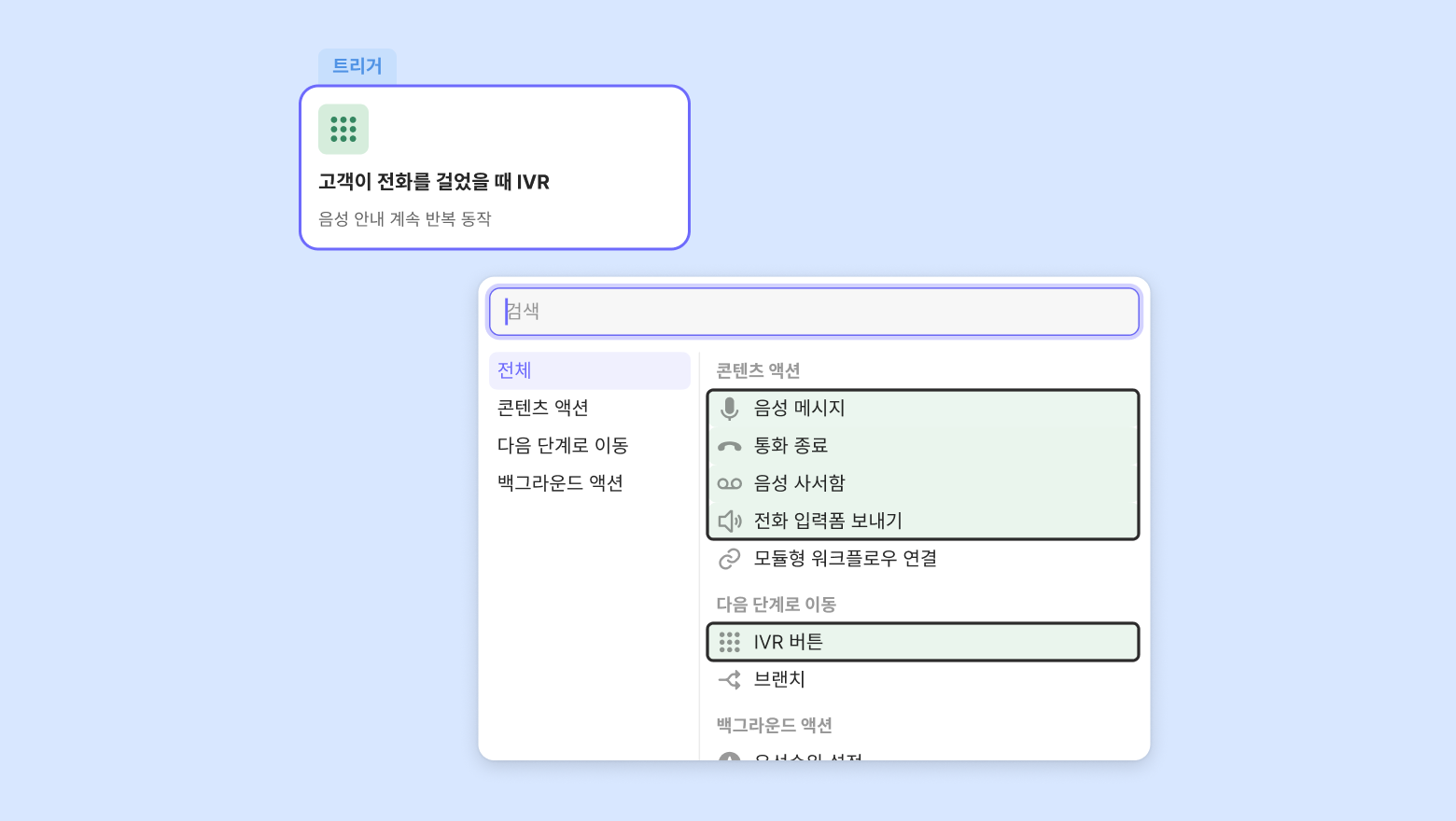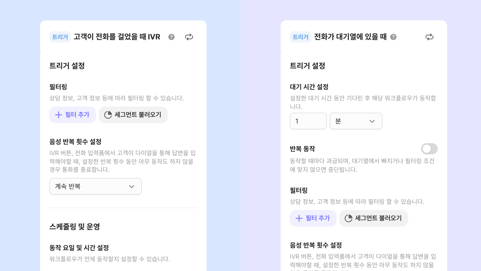 더 정교한 IVR을 만들고 싶다면 IVR에 필요한 트리거, 필터링, 액션을 참고하여 원하는 시나리오를 마음껏 구성할 수 있어요.