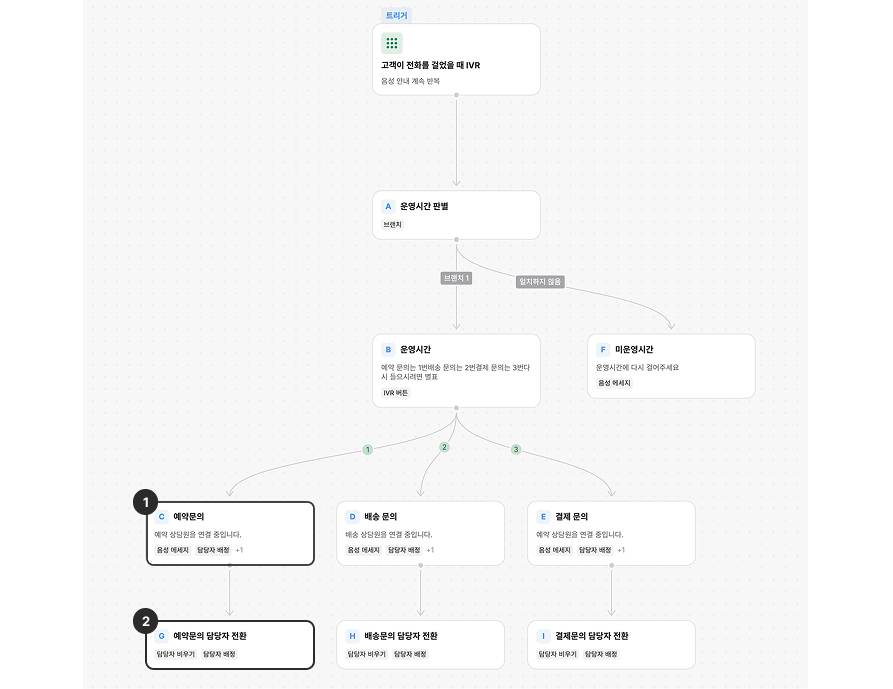 미운영 시간 안내: 운영시간과 일치하지 않음과 연결된 C 단계에서 [액션: 음성메시지]를 선택합니다. 미운영 시간에 고객이 전화했을 때 듣게 될 음성을 작성해주세요. 음성 송출 후 전화는 자동으로 끊어지게 됩니다.