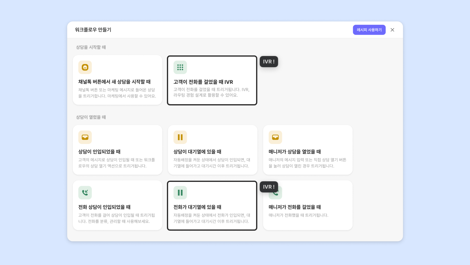 자주 사용하는 IVR 유형은 레시피로 이미 만들어두었어요. 필요한 레시피를 선택하여 세부 내용만 수정하여 쉽게 사용해보세요.