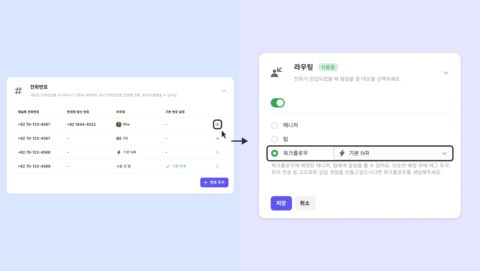 번호에 원하는 IVR을 연결하기 위한 단계입니다. IVR 이 여러 개이거나, 채널에서 사용하는 번호가 여러 개일 경우 설정해주세요.