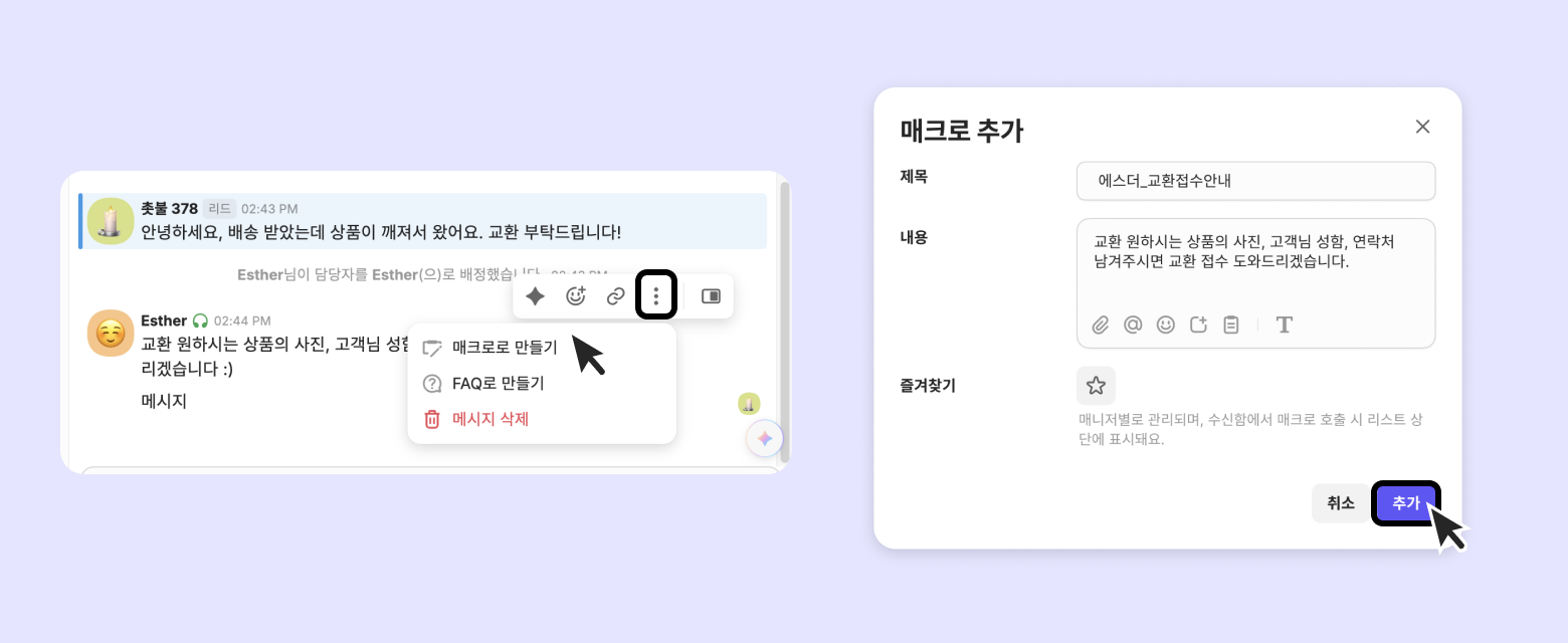 고객과 상담 중 전송한 메시지를 바로 매크로로 생성할 수 있어요.