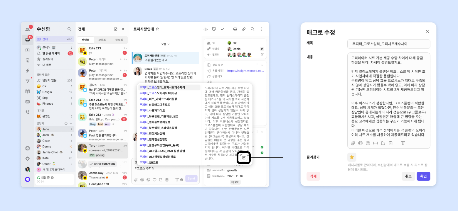 매크로 검색 창에서 내용을 미리 확인할 수 있어요. 그대로 전송하거나 바로 수정하여 보낼 수도 있습니다.
