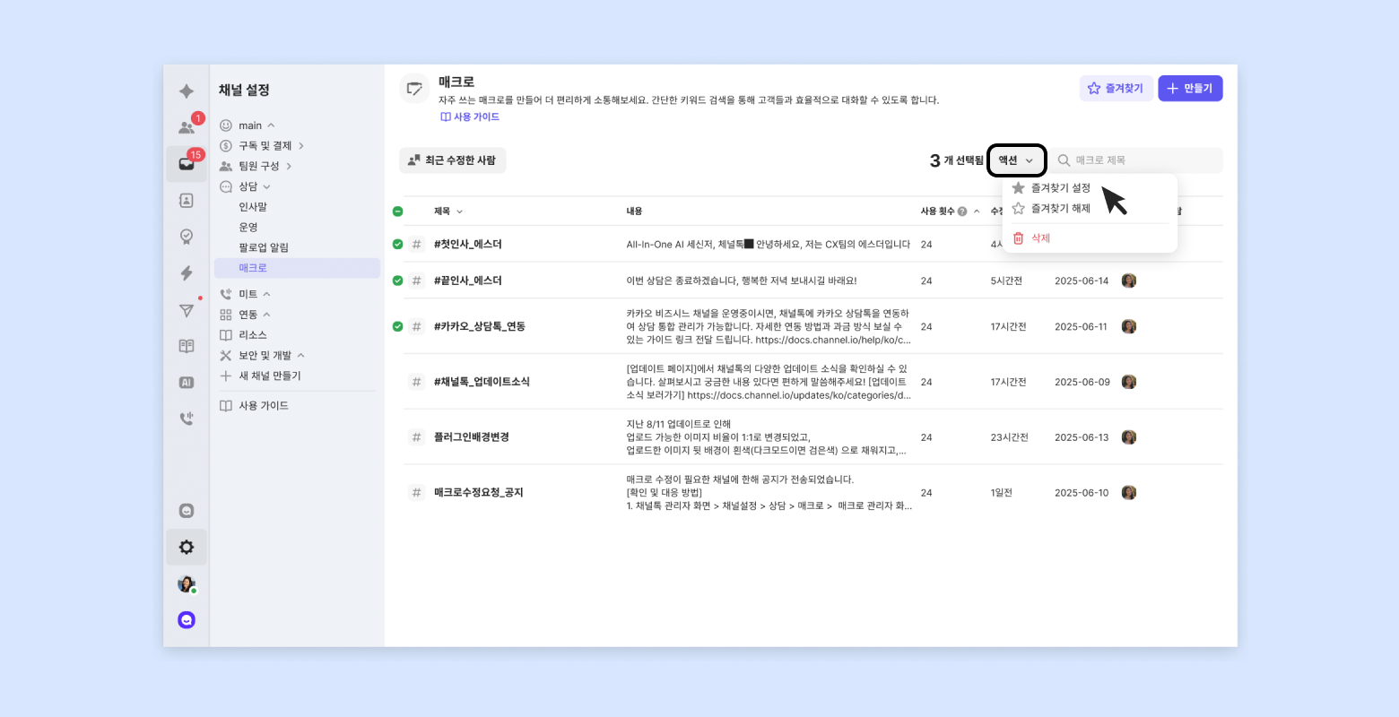현재 생성된 매크로 총 갯수와 매크로 제목, 내용, 사용 횟수, 수정 시간, 생성 시간, 최근 수정한 사람을 확인할 수 있어요.