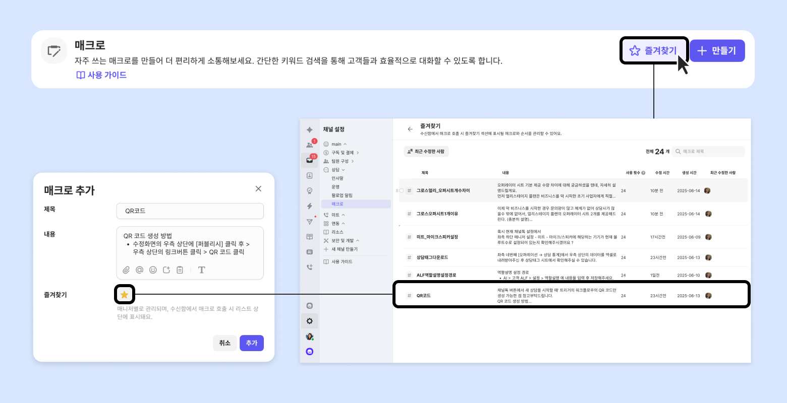 매크로 추가/수정 창에서 별 이모지()를 클릭해 즐겨찾기 가능해요.