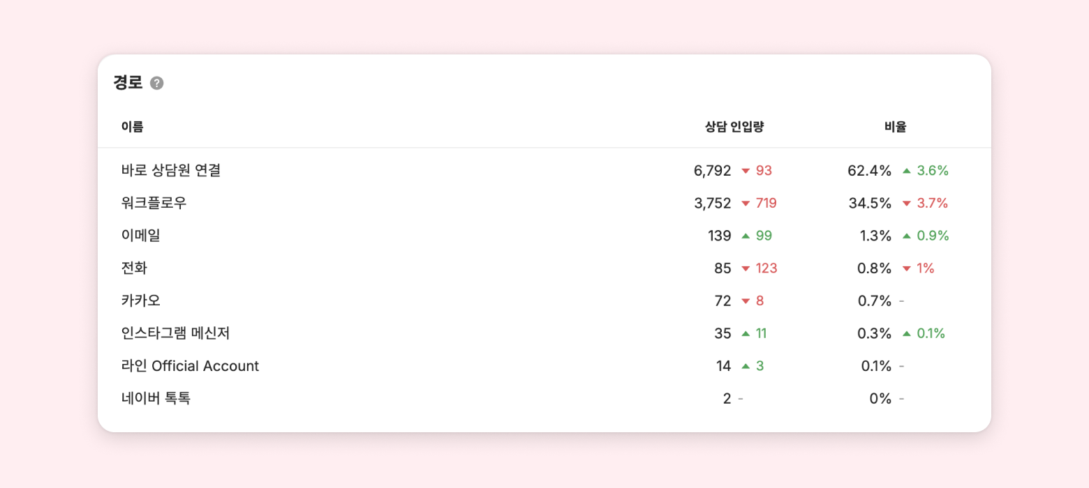 설정한 기간동안 어떤 경로를 통해 상담으로 유입 되었는 지 보여줍니다. 이미 상담이 한 번 진행된 상담으로 다시 말을 걸 경우, 최초 경로 정보 그대로 보여집니다.