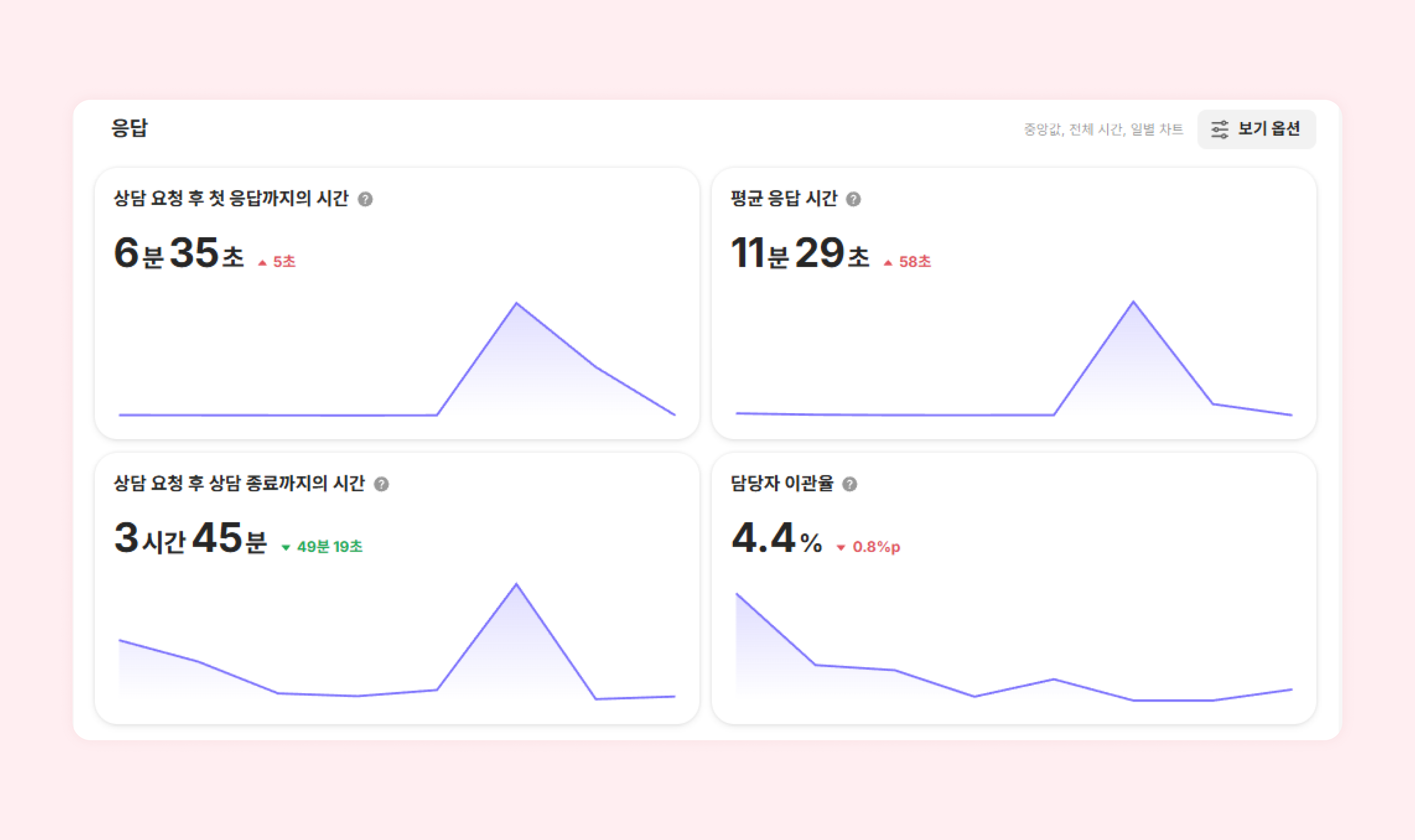 유입된 문의의 응답 시간이나 담당자 이관률 등을 확인할 수 있습니다. '보기 옵션'을 선택하면 원하는 조건에 맞춰 응답 결과를 확인할 수 있습니다.