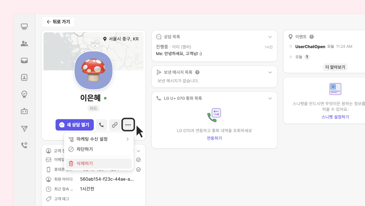 • 채팅상담 기록이 있거나, 고객 연락처 정보가 있는 유저