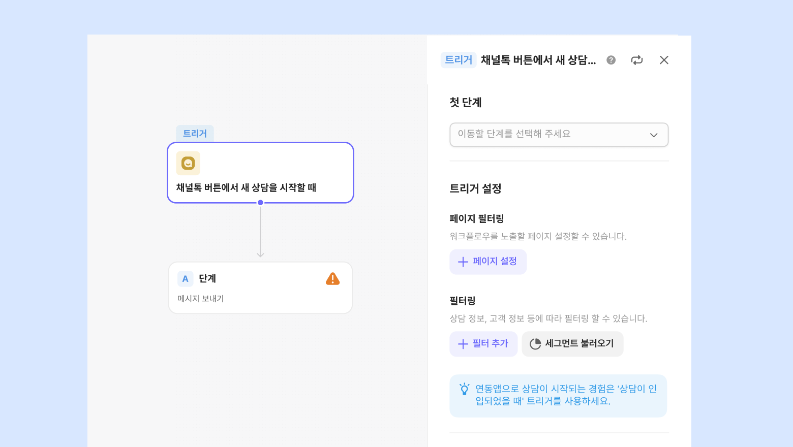 단계는 여러 개의 액션으로 구성된 블록이에요. 고객에게 전달할 메시지와 응답 버튼을 사용해서 챗봇처럼 설정할 수도 있고, 어떤 태그를 부착할지, 어떤 팀이 배정될지도 설정할 수 있습니다.