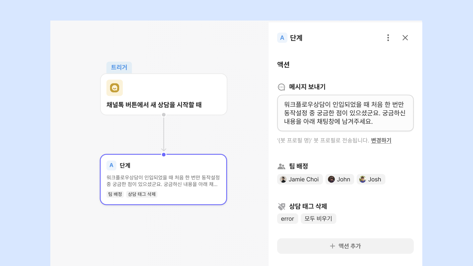 고객에게 메시지 보내기, 담당자 배정하기, 상담 종료하기와 같이 상담에 필요한 모든 액션을 워크플로우 하나로 설정할 수 있어요.