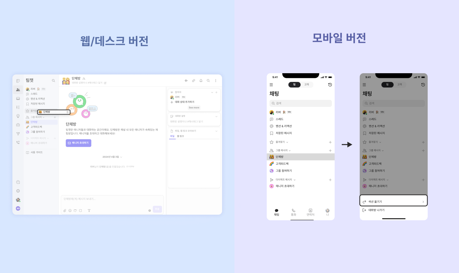 PC 와 모바일 앱 모두 팀챗 섹션 생성, 순서변경, 삭제, 대화방 옮기기 등의 작업이 가능하며, 변경 내역은 모든 기기에 동일하게 적용됩니다.