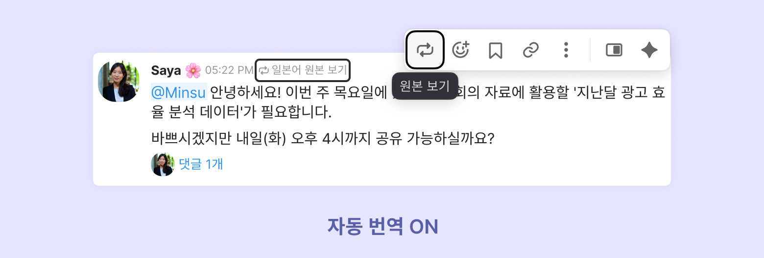자동 번역 ON: [제외 언어]로 설정한 언어를 제외하고 자동으로 번역되어 표시됩니다. [원본 보기]를 클릭하여 번역이 적용된지 않은 원본 메시지를 확인할 수 있습니다.