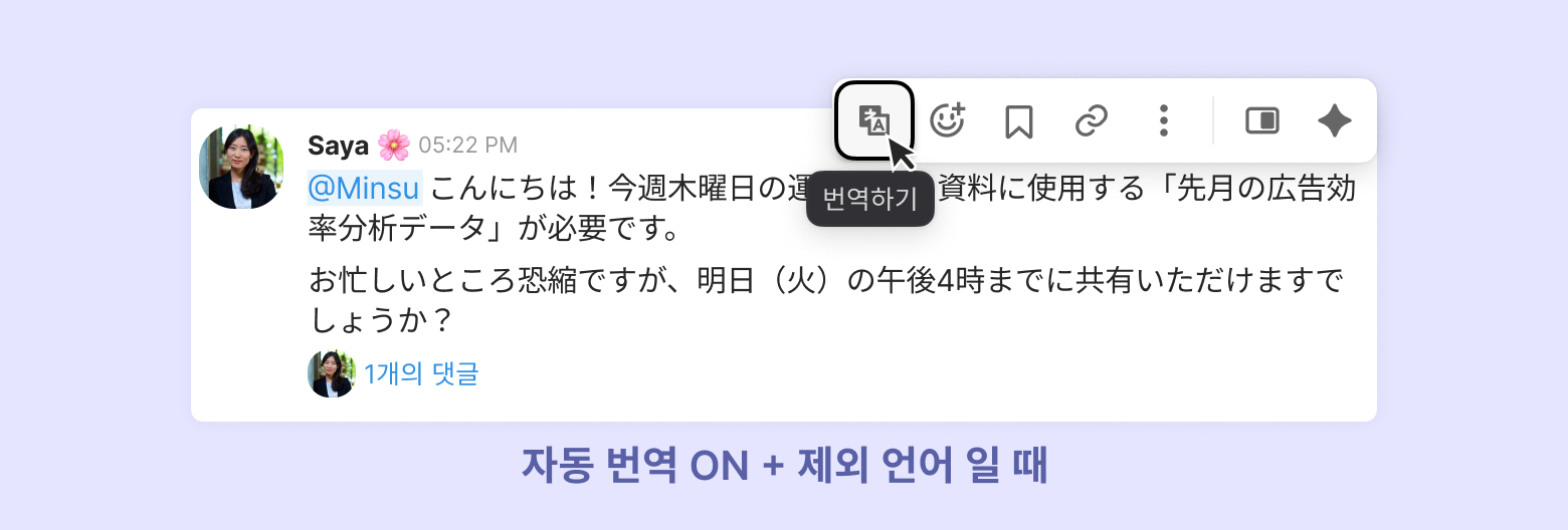 [제외 언어]로 설정한 언어의 경우 메시지에 마우스를 올려 [번역하기]를 클릭해야 번역된 내용을 확인할 수 있습니다.