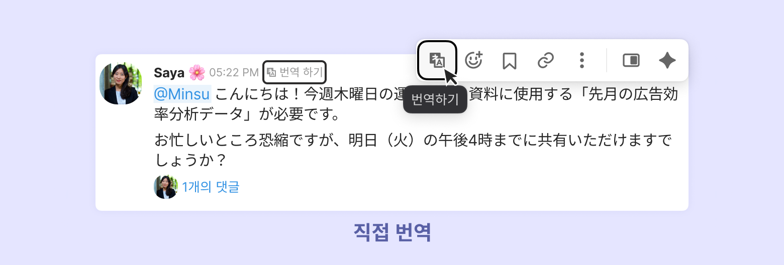 팀 멤버 본인 메시지 번역하기: 본인이 작성한 메시지를 번역하려면, 해당 메시지에 마우스를 올린 후 [번역하기]를 클릭하세요. 번역된 내용을 바로 확인할 수 있습니다.