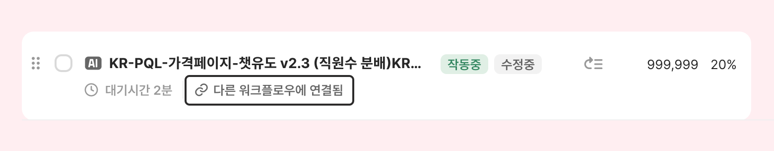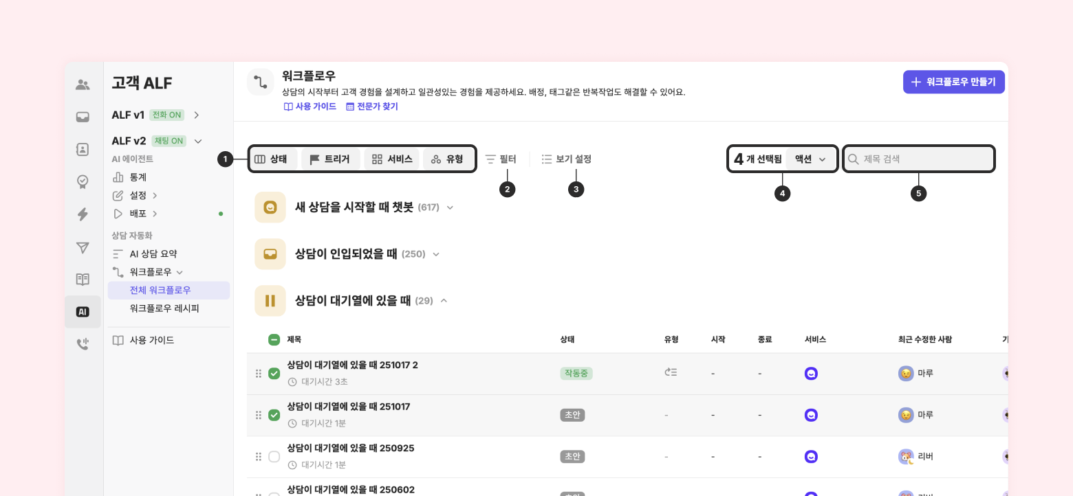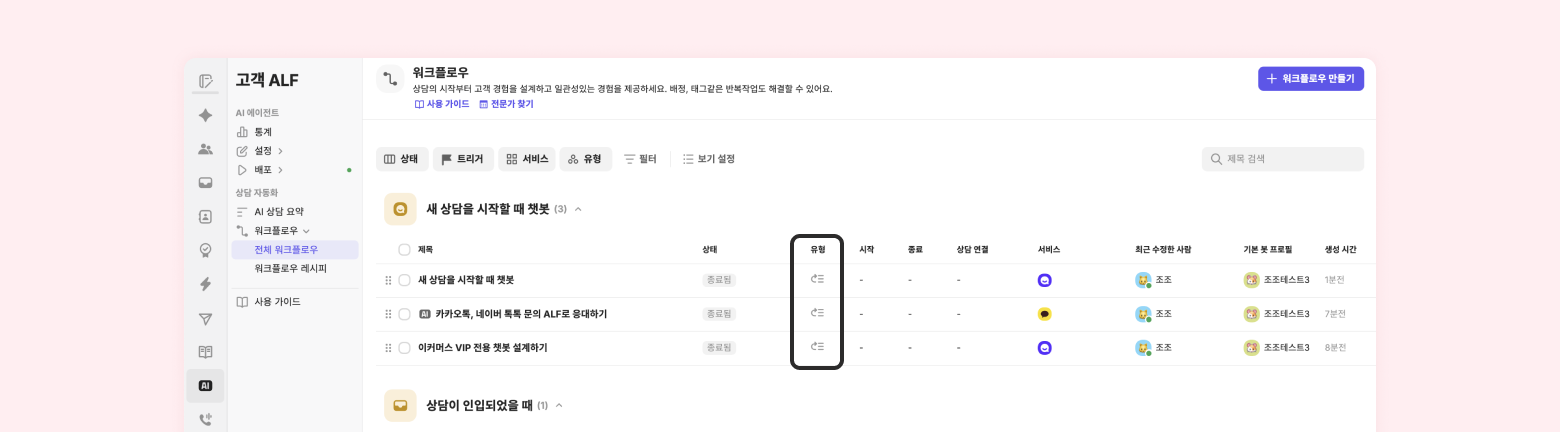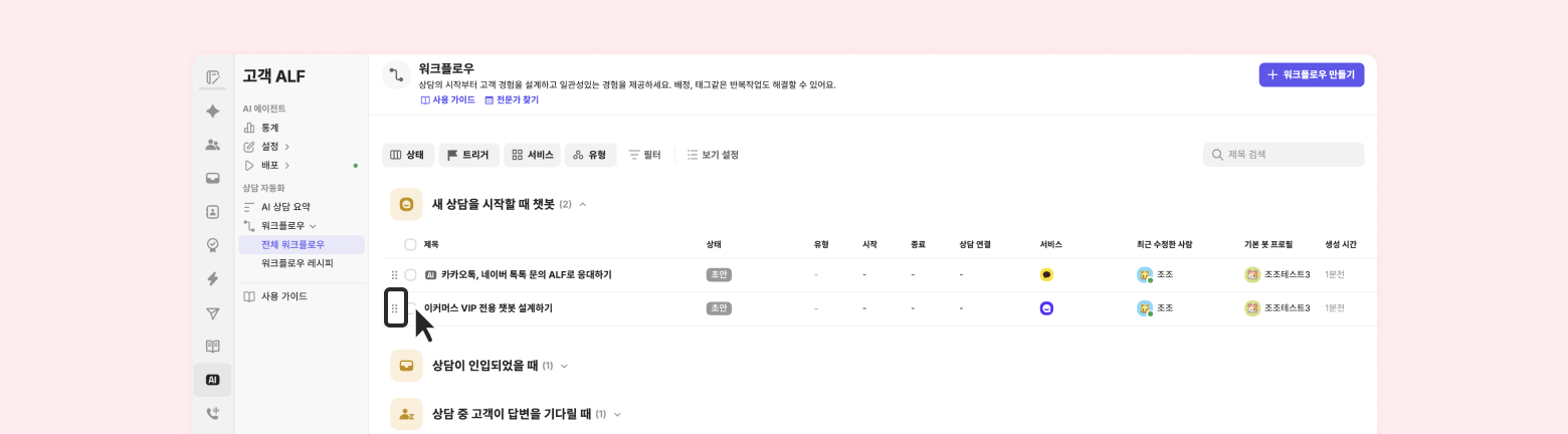 워크플로우의 액션에 ‘AI 챗봇(ALF)가 응대’가 포함되어 있다면 워크플로우 이름 앞에 AI가 표시됩니다.
