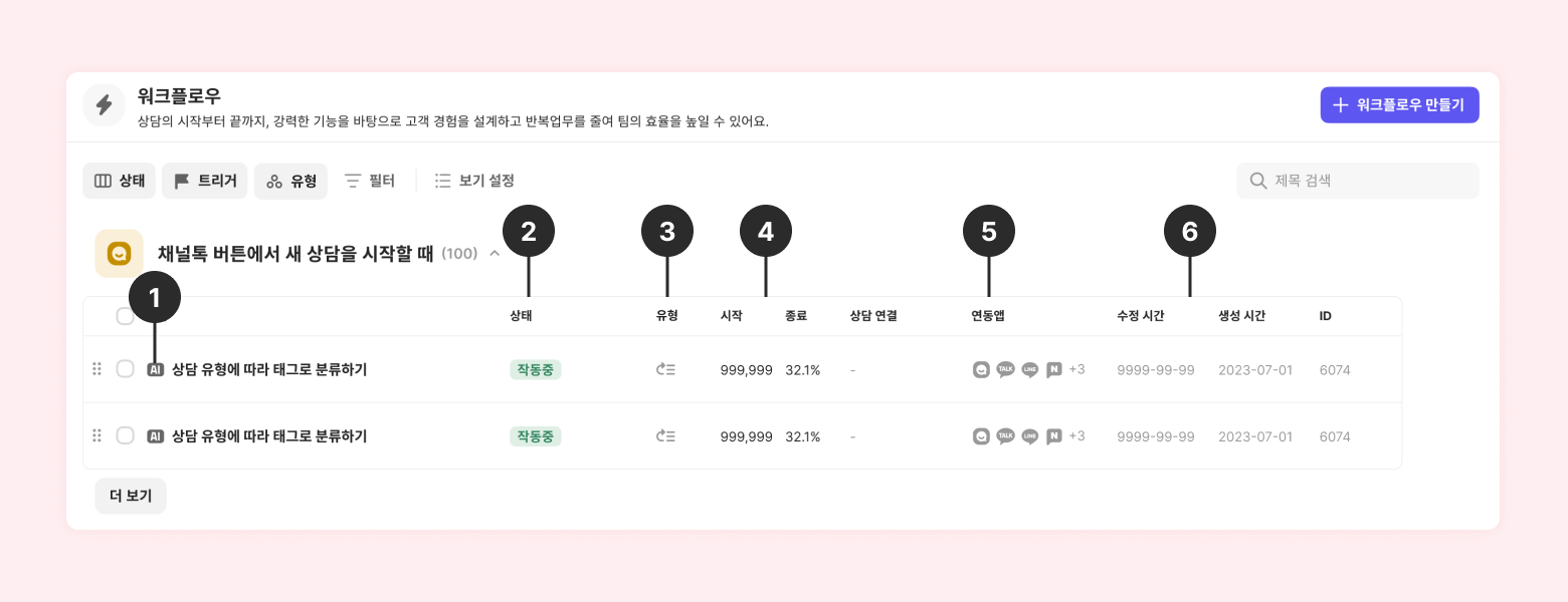 트리거를 기준으로 워크플로우가 정렬되어 보여지며, 워크플로우의 이름과 상태, 유형 등의 정보를 한눈에 확인할 수 있습니다.