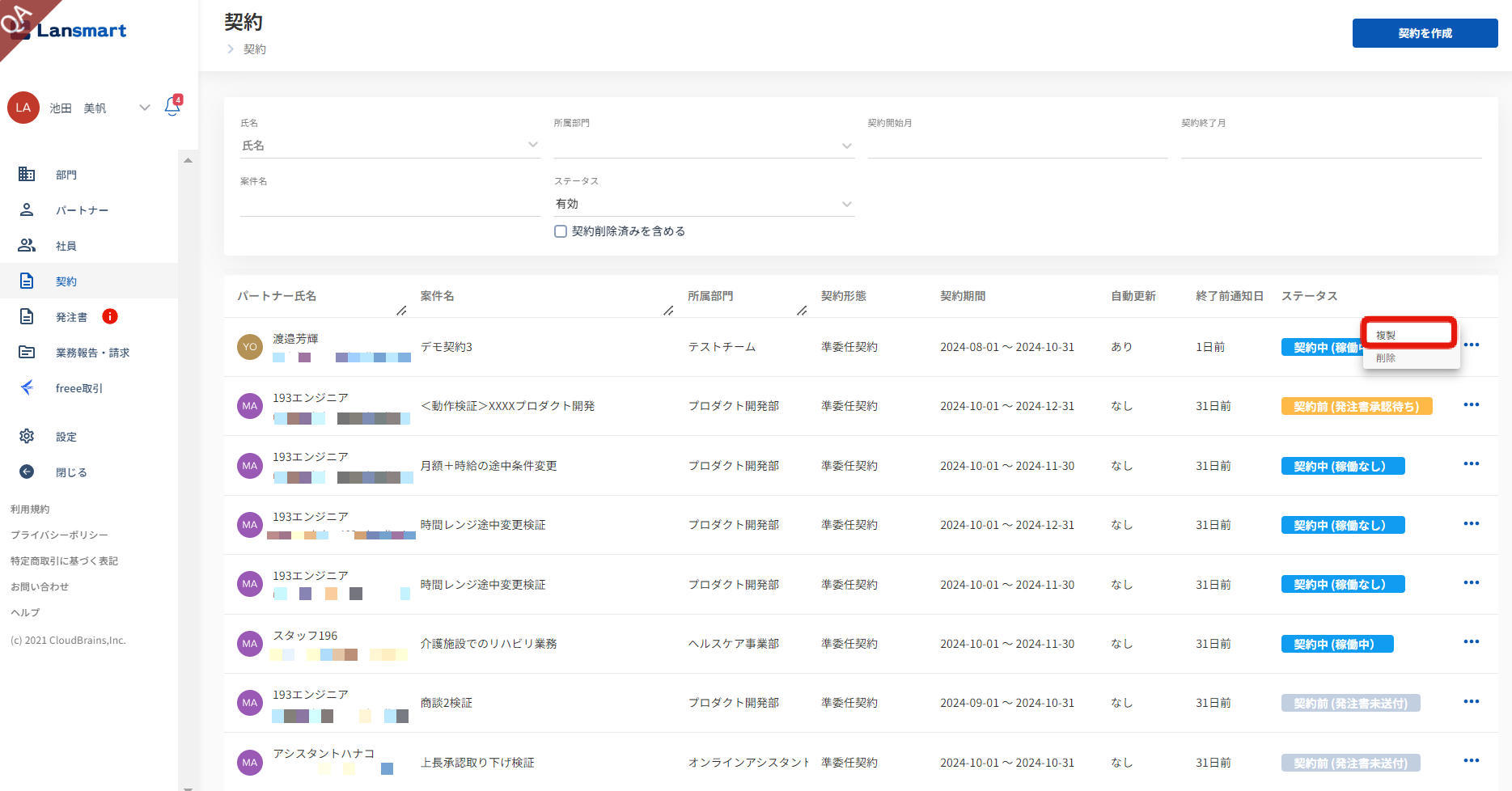 契約の複製機能を使い、新規で契約を作成します。 契約作成については、こちらのヘルプページもご参照ください。