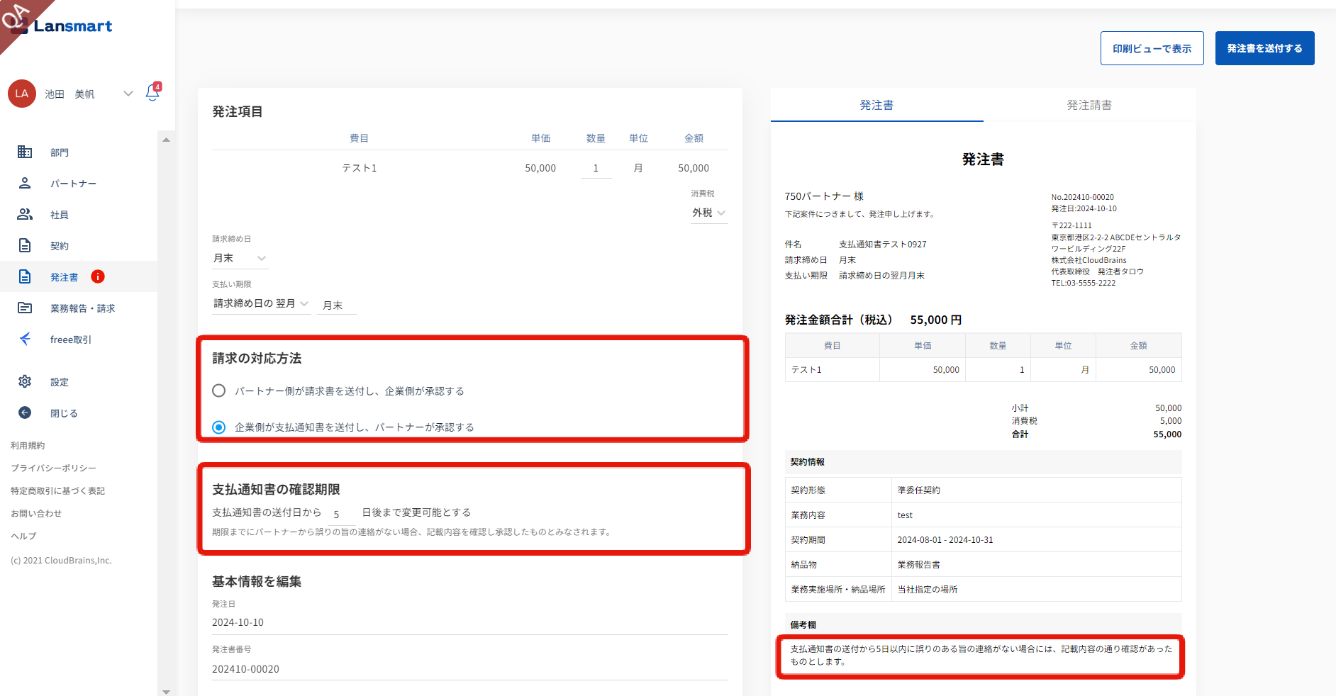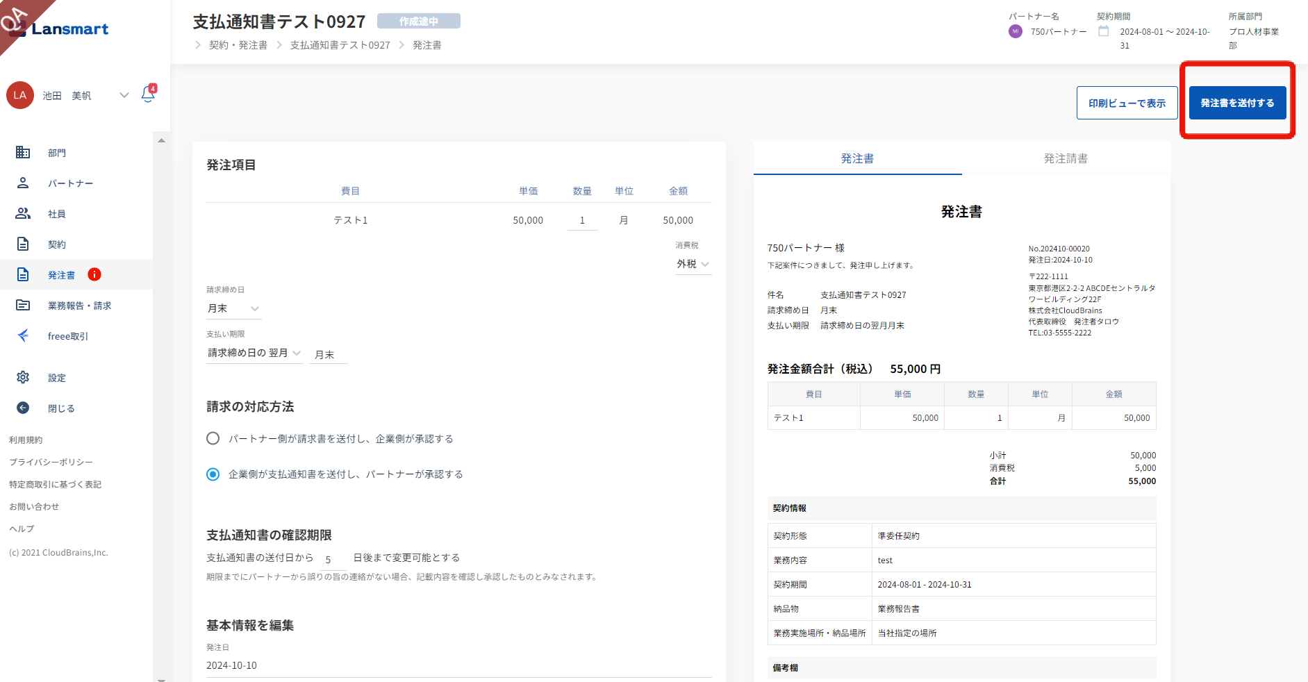 請求方法を変更したい場合は、契約を新規で作成いただきますよう、お願いいたします。 新規で契約作成し、その発注書にて請求方法を「企業側が支払通知書を送付し、パートナーが承認する」にして発注書をパートナー様に送付してください。 詳しくは下記手順をご確認ください。