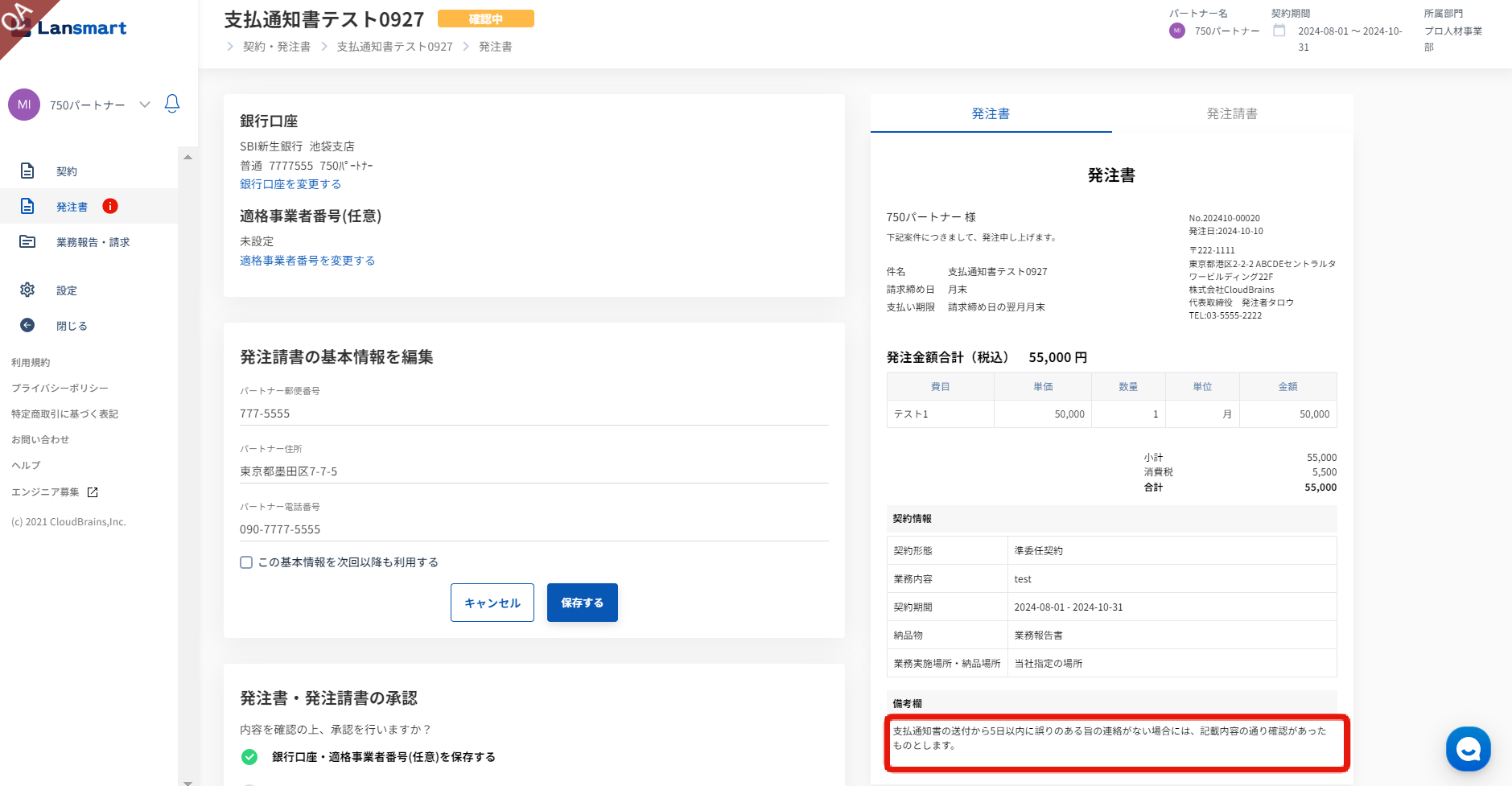 支払通知書の確認期限を設定します。1日から7日まで設定することができます。 (デフォルトでは、5日の設定になっています。) ※期限までにパートナーから誤りの旨の連絡がない場合、記載内容を確認し承認したものとみなされます。 右側の発注書プレビュー画面の備考欄に、「支払通知書の送付からXX日以内に誤りのある旨の連絡がない場合には、記載内容の通り確認があったものとします。」と記載されます。