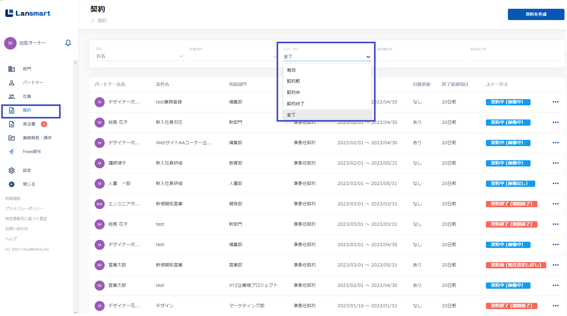※契約一覧では、ステータス(契約前・契約中・契約終了)でフィルタをかけることができます。