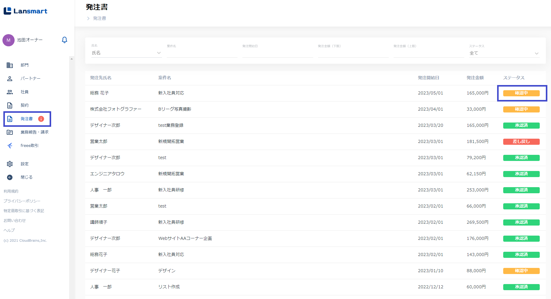契約中(稼働中):パートナーは発注書を承認済みで、業務登録が1件以上登録されている状態