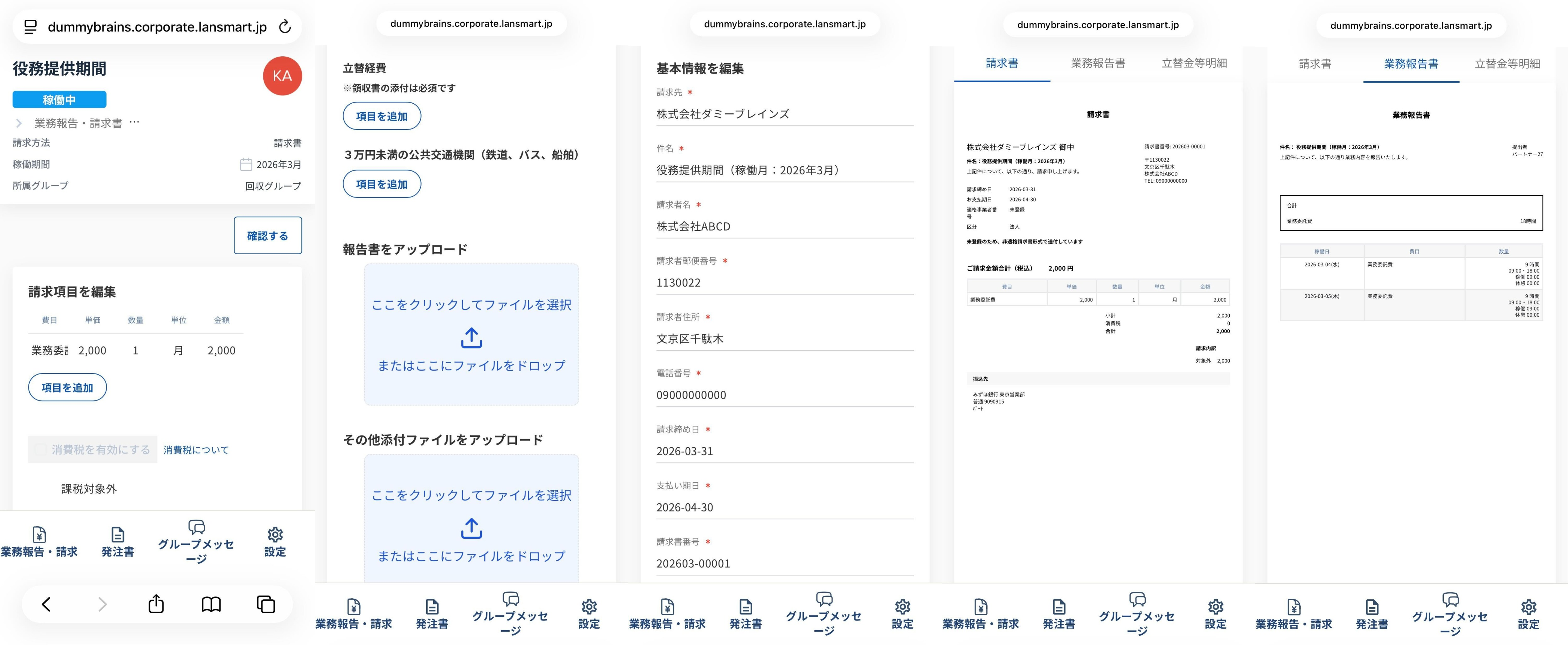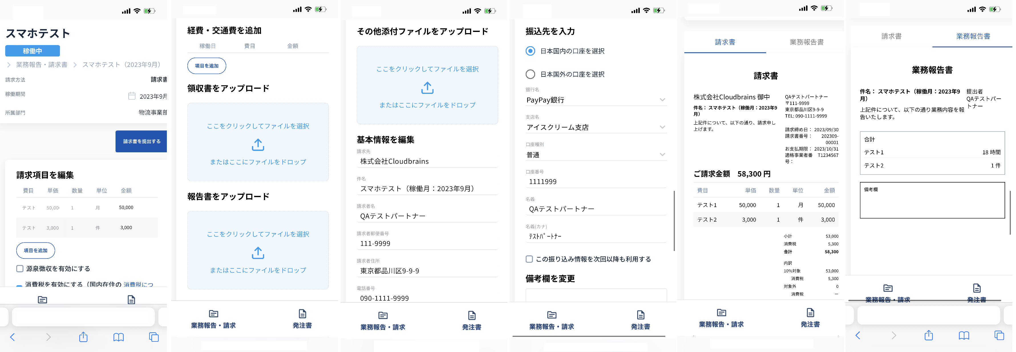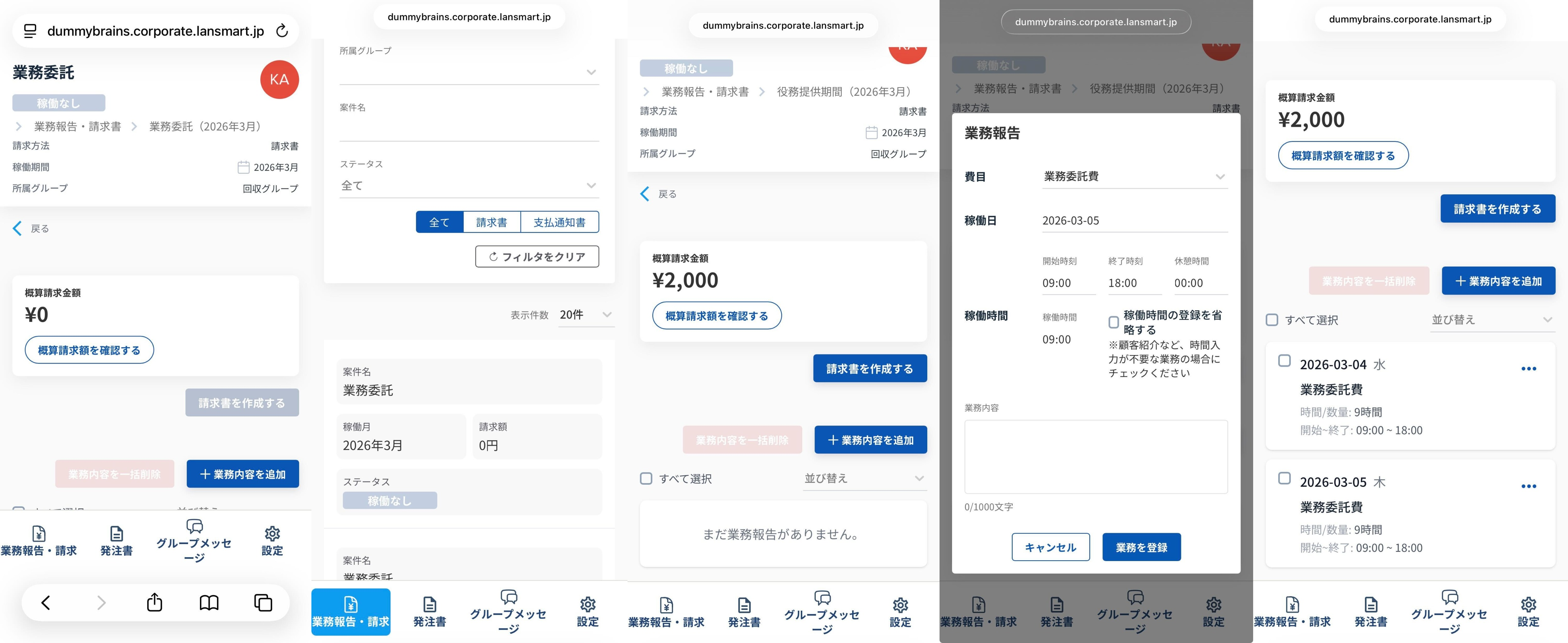 スマートフォンの場合、左メニューから画面下部のメニューに変更になり、「業務報告・請求」「発注書」についての操作が可能です。