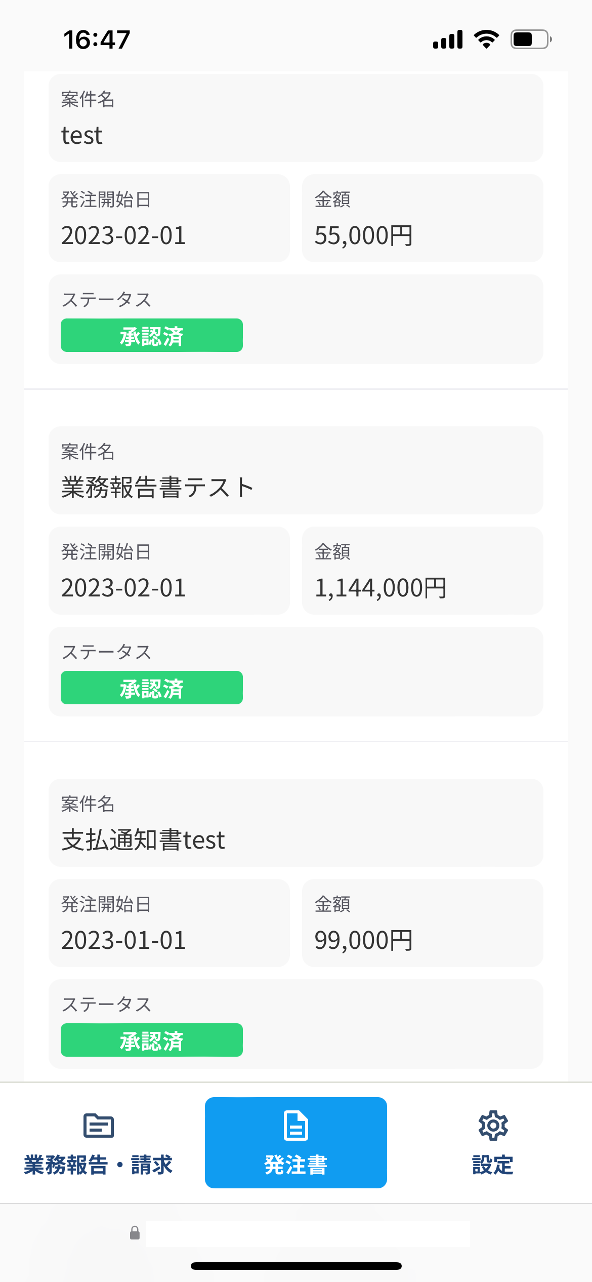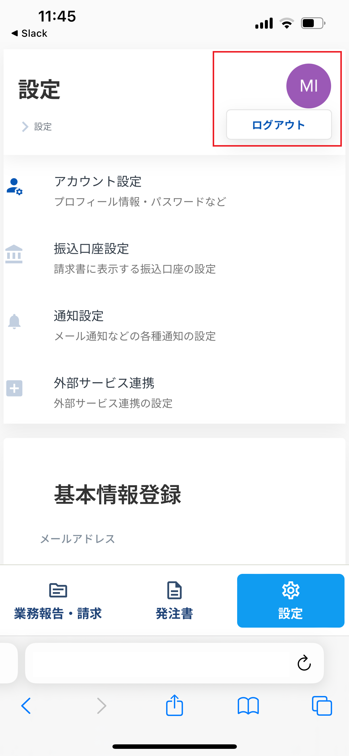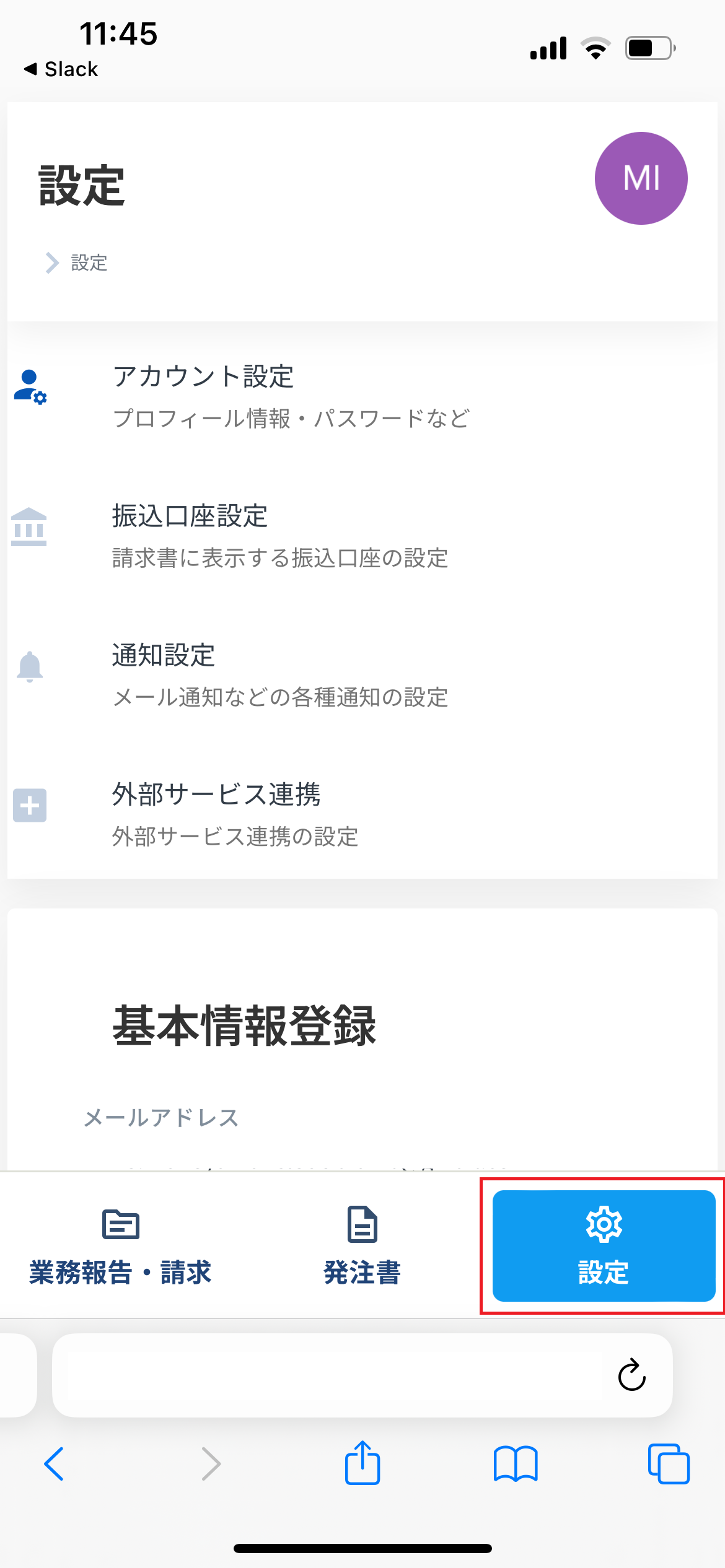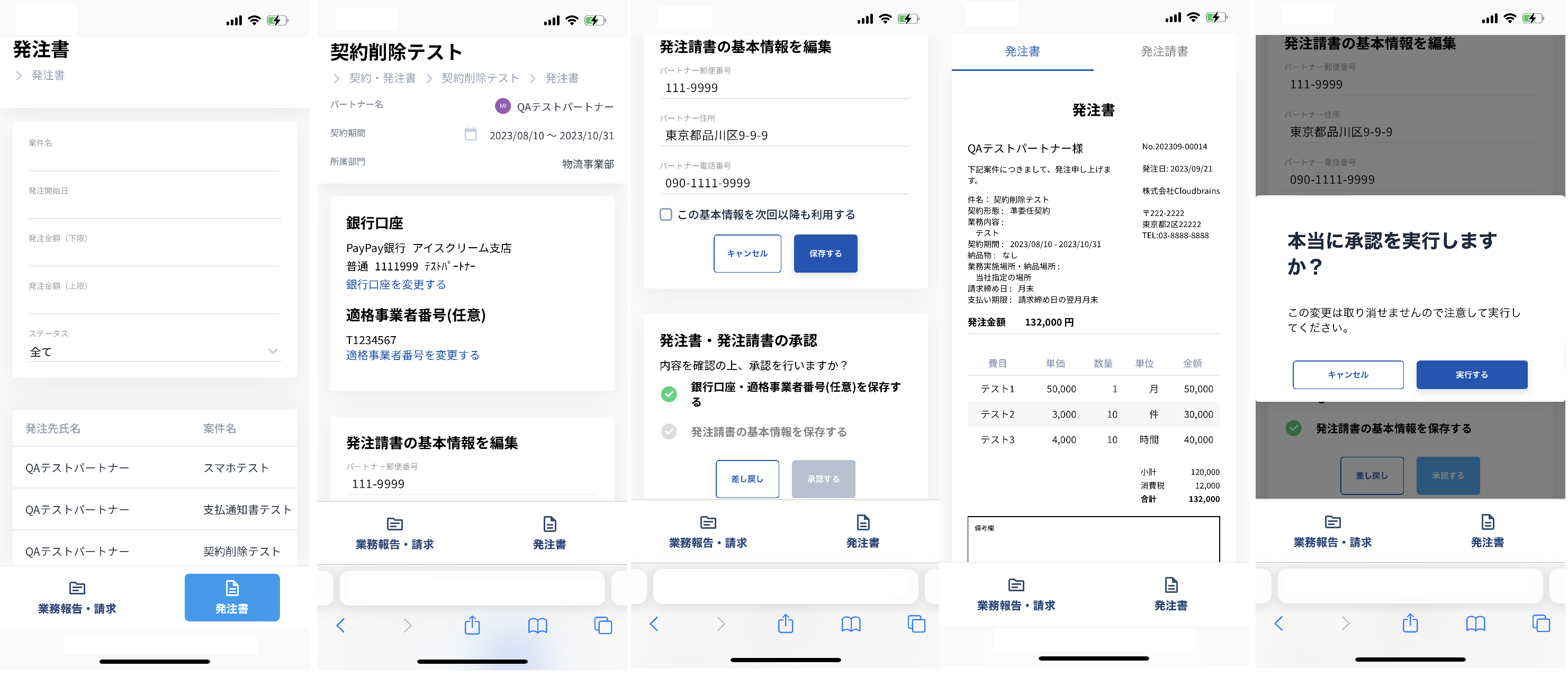 スマートフォンの場合、左メニューから画面下部のメニューに変更になり、「業務報告・請求」「発注書」についての操作が可能です。