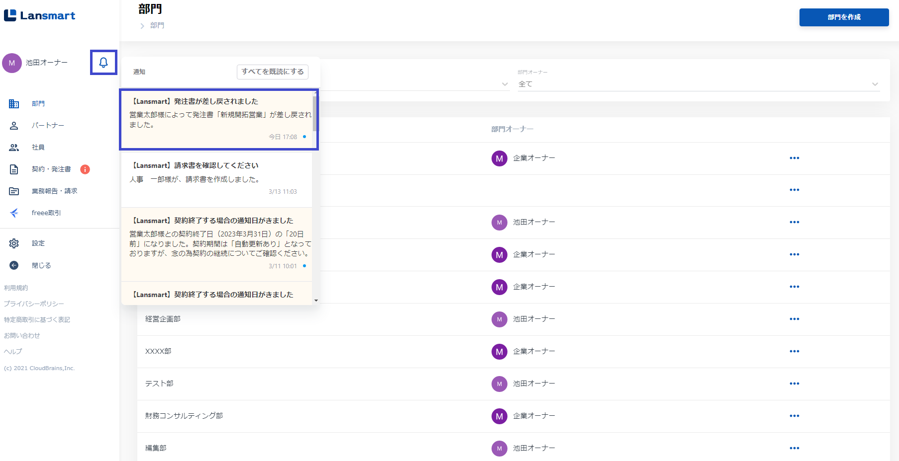 パートナー様から発注書が差し戻しされますと、名前右横のベルマークに通知がございます。