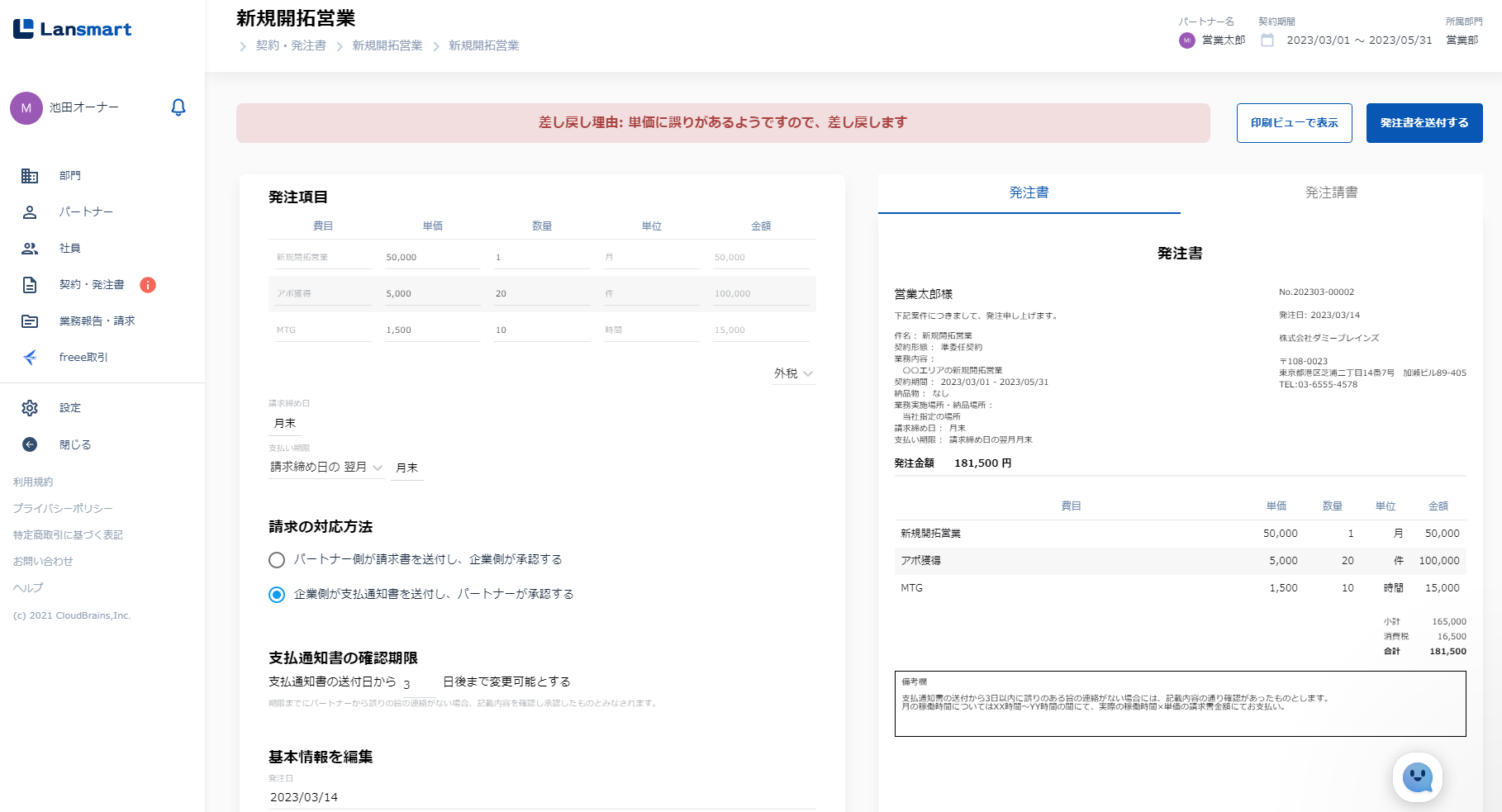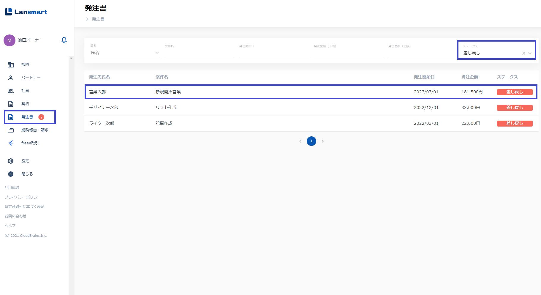 左メニューの「発注書」をクリックすると、企業側で作成された承認済みの発注書が一覧になって表示されています。ステータスのフィルタを「差し戻し」にしますと、パートナー様から差し戻された発注書が表示されます。パートナー氏名、案件名を確認し、該当の発注書をクリックしてください。