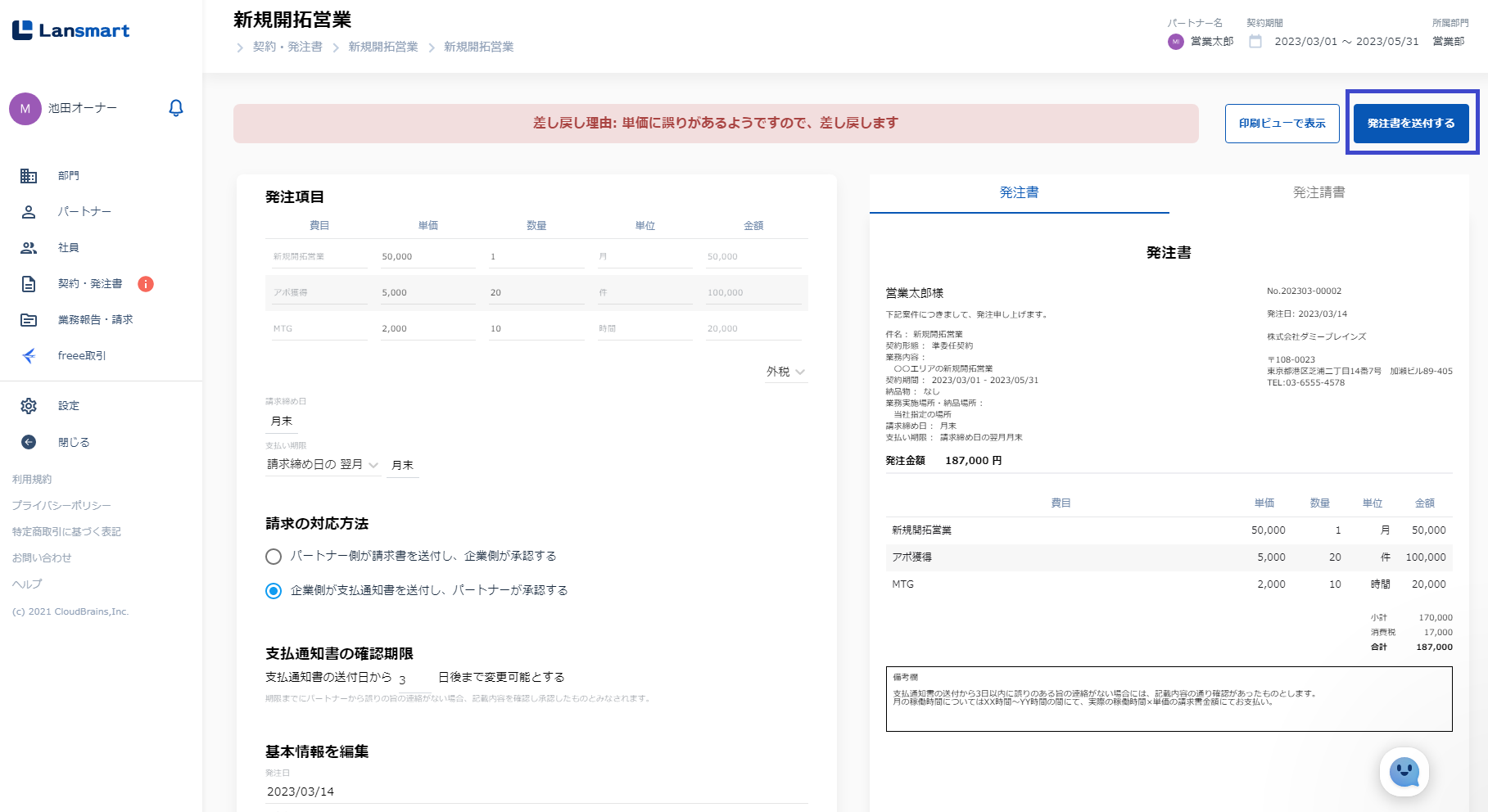 内容の修正が完了したら、画面右上の「発注書を送付する」ボタンを押して、送信します。